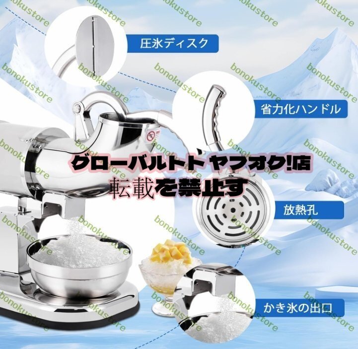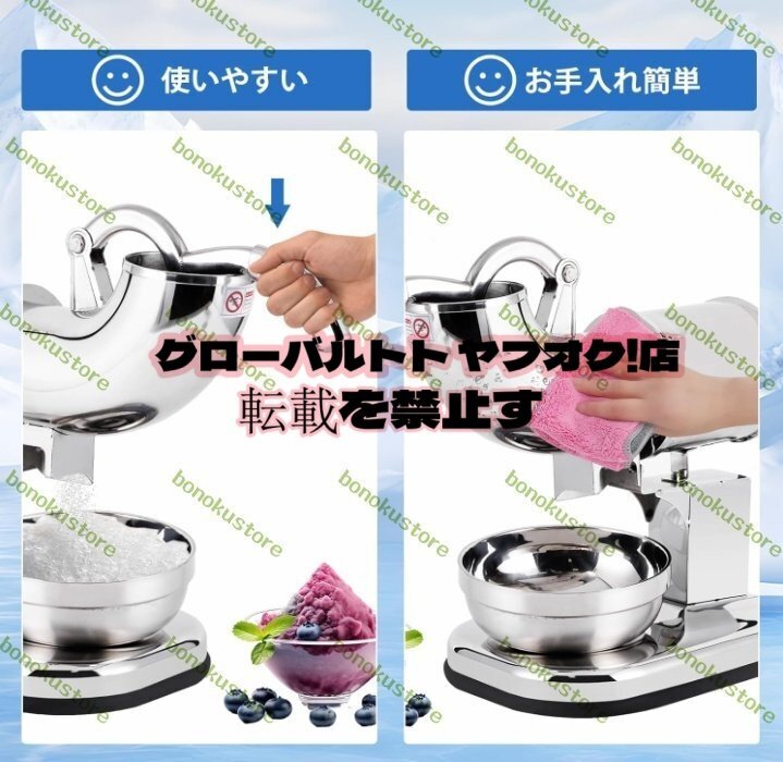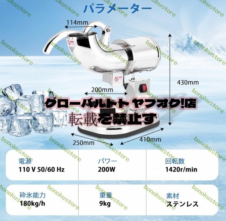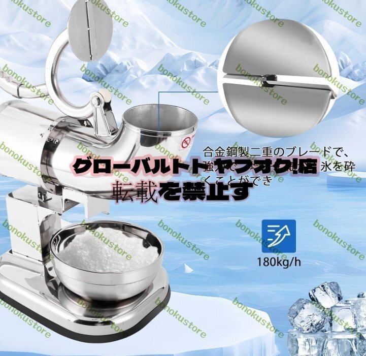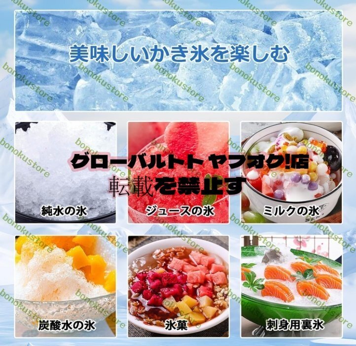 【高出力】パワー200Wで、約1400r/min、1時間あたり180kg以上の氷を砕くことができます。角氷がおしゃれなクラッシュアイスに変身、かき氷、スムージー、カクテル、刺身用、冷却用に最適な小粒砕氷です。【両刃】二重のブレードで、強力に、均一に細かく氷を砕くことができま