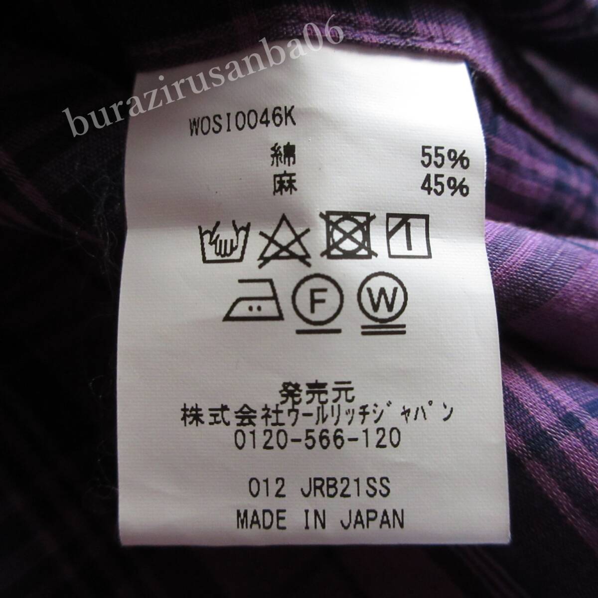 アメリカ 老舗アウトドアメーカー ウールリーチ 半袖シャツです。 通気性や吸水性などに優れた 麻素材混紡の 軽量で涼しいチェックシャツ。 縫製もしっかりしていて 丁寧なつくりです。 サイド裾はマチ付き。 左胸にポケット1つ。 日本製。 ◇株式会社 ウールリッチジャパン正規品 ◇状態:未使用 下げ札有 外装なし ◇定価:19,800円 税込 ◇素材:綿55% 麻45% ◇カラー:パープル (落ち着きのある色合いです) ★サイズ表記 メンズ M 実寸 身幅 51.5cm 肩幅 46cm 着丈 74cm(背面) 袖丈 24cm ※多少の誤差はご了承ください ※商品の実寸には個体差による若干の誤差がございます ★ご新規 評価一桁の方は入札ご遠慮ください ●モニター環境により実際のお色と異なる場合がございます ●採寸方法は全アイテム「平置き」です。 採寸方法により、若干の誤差(伸縮による1~2センチの誤差)は あると思われますがご了承下さい。 | |||