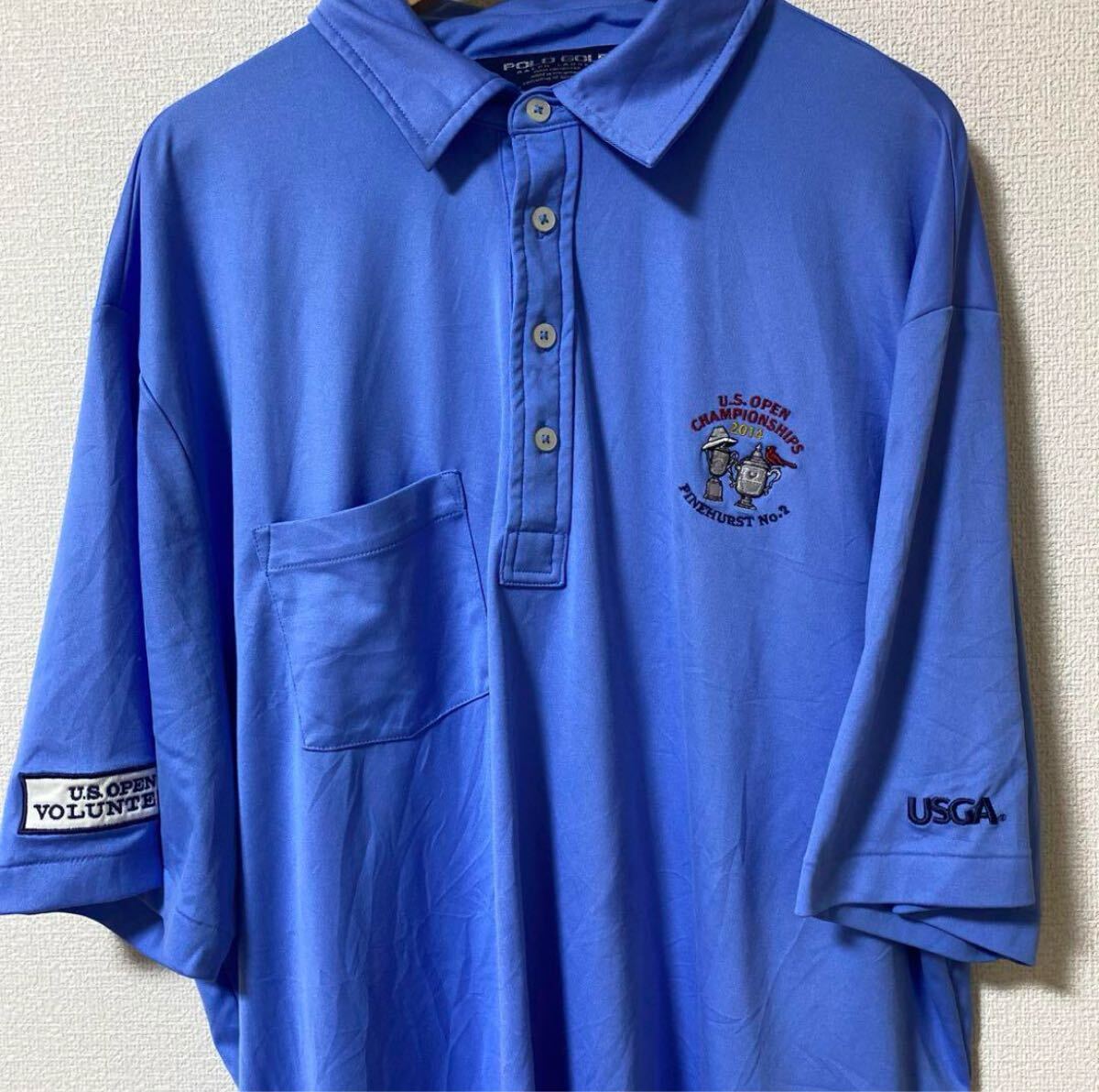 青色の半袖ポロシャツ、胸ポケット付き、刺繍ロゴあり。