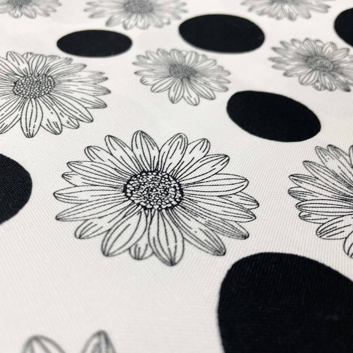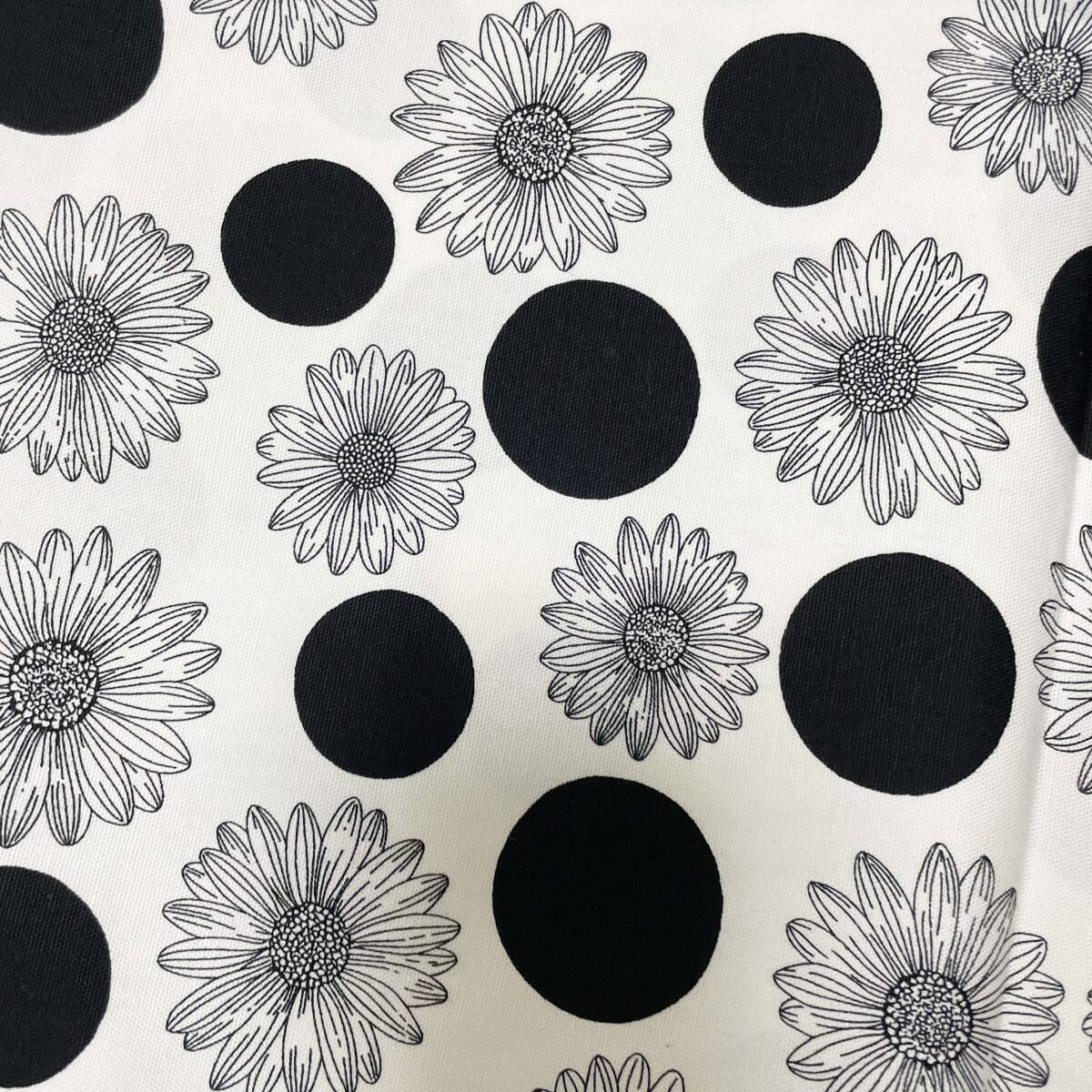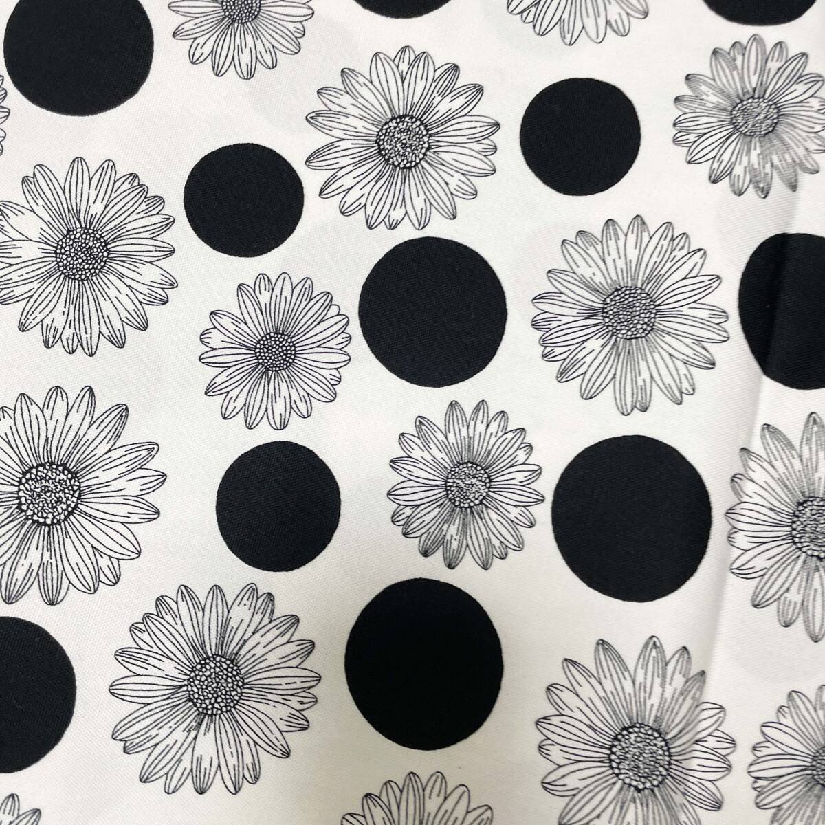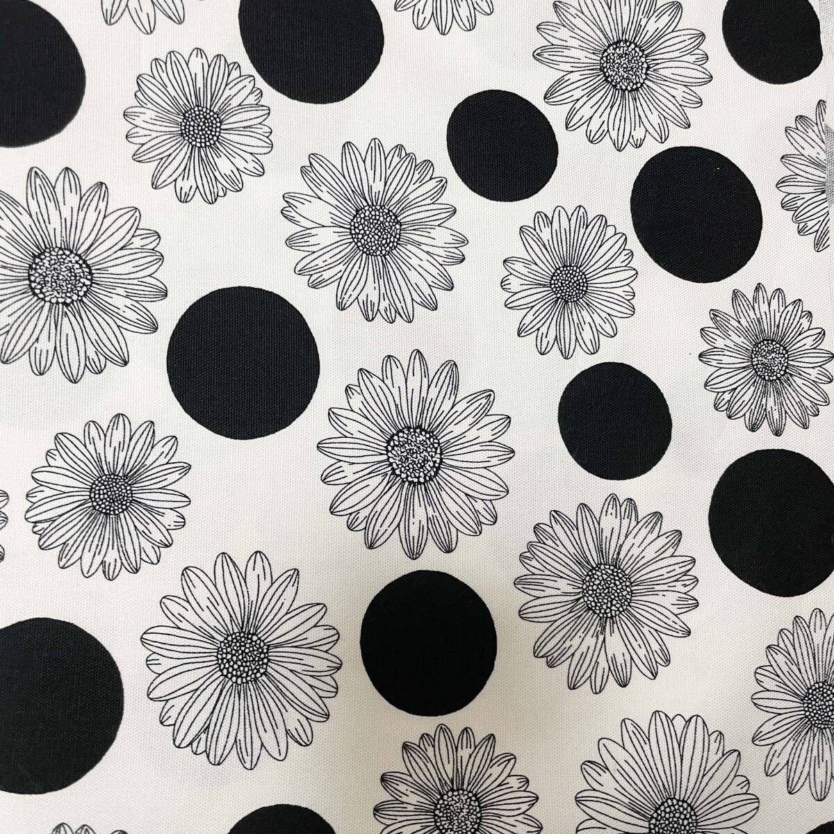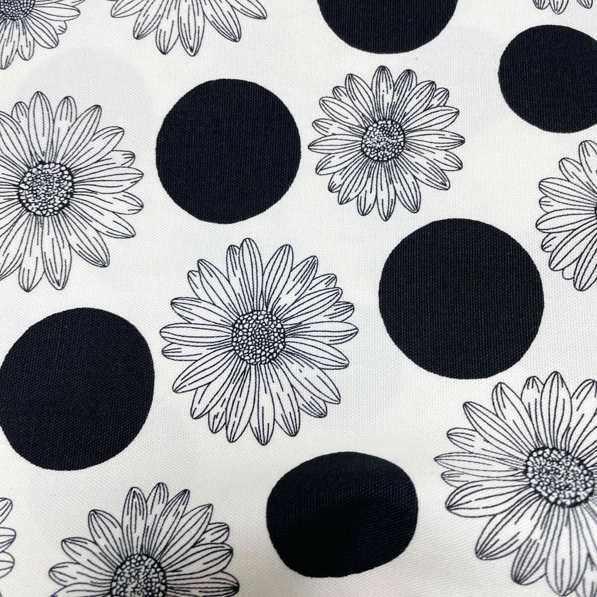 線描きマーガレットの花柄と水玉オックス生地はぎれモノトーン布コットン1m白黒