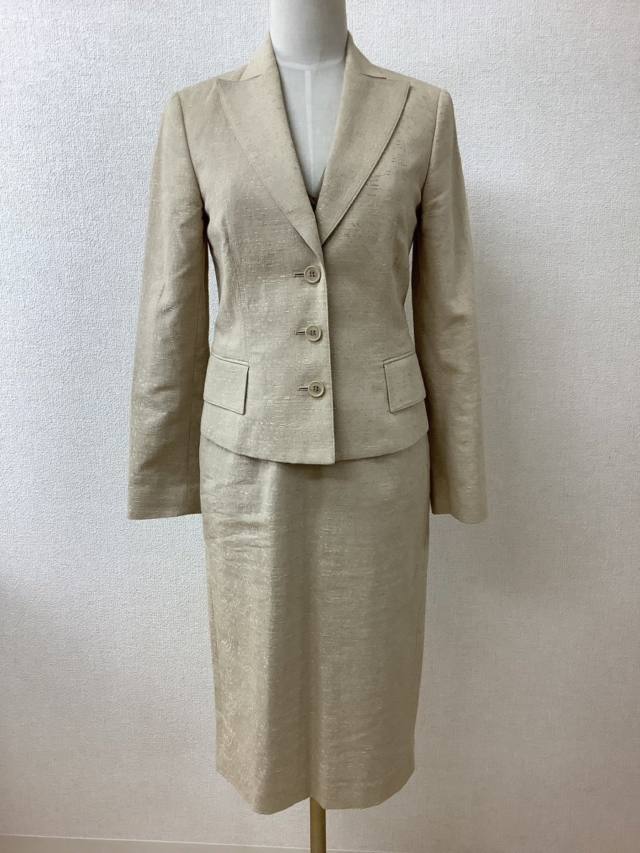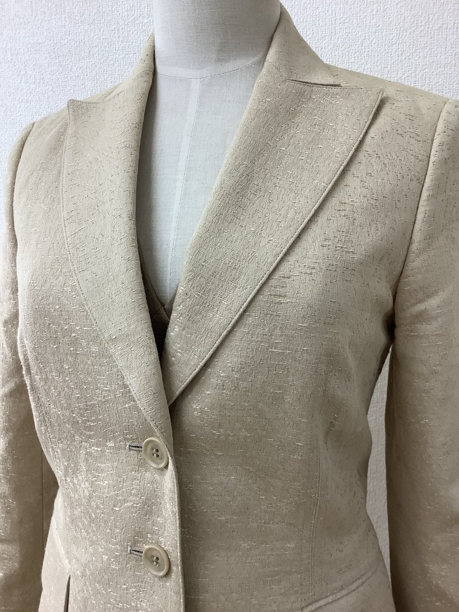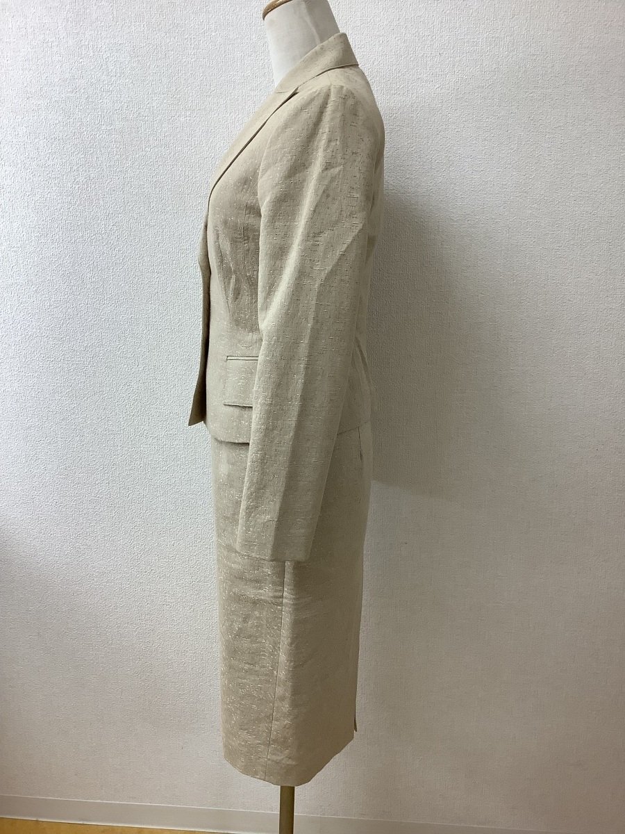 | 管理番号:136464 kulson カルソン ワンピーススーツ ベージュ地模様 表示サイズ:ジャケット38 ワンピース36 実寸(参考)