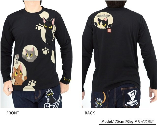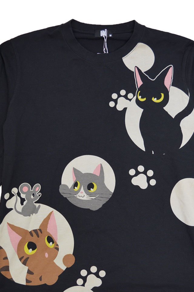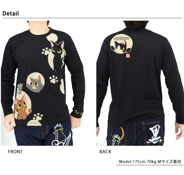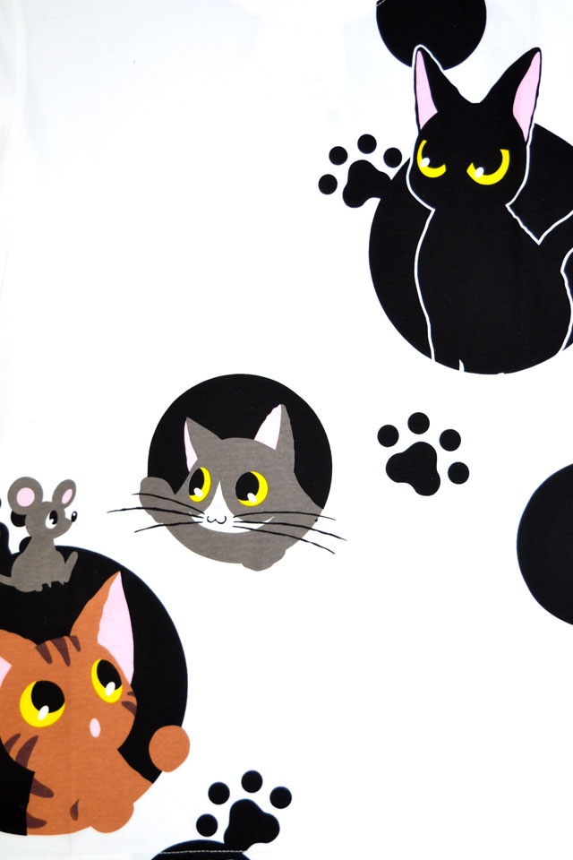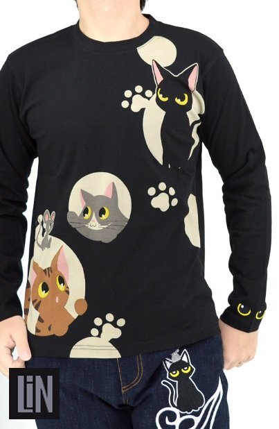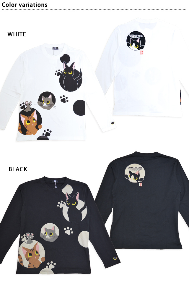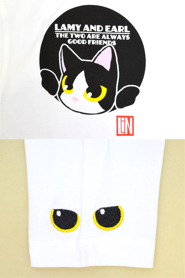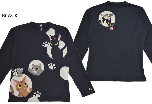 何でもあり、何でもやる新ブランド「LIN」から「ラミ&アール 水玉模様からこんにちわ ロングTシャツ(AL-75124)」のご紹介です。 黒猫のLamy(ラミ)とネズミのEarl(アール)。 水玉模様から顔を覗かせたラミとアール。 今回はお友達の猫たちもずらりと勢ぞろいです! 左袖にはラミの目をワンポイントで刺繍しました。 | |||||||||||||||||||||||||