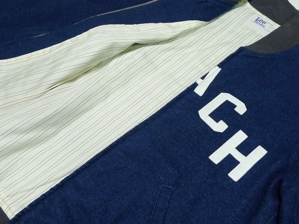 | 新品未使用。「Lee・リー」のヴィンテージなデイリー・カジュアル・ウェアを再現した「Lee Sportswear」シリーズのLeeSHOP限定販売モデルのスポーツ・ジャケット「COACH JACKET コーチ・ジャケット」のサイズSMALL(36相当)になります。カラーはネイビーでリブ・パーツがグレーのノスタルジックなカラーリングのオールド・スタイルのスタジアム・ジャケットになります。(品番LS1110-104,定価25,000円、税込み27,500円)。Leeのジーンズの代名詞「101」に合わせるトップスとして製造されたLeeSHOP限定販売モデルになります。オールドなヴィンテージ・スタイルのスタジアム・ジャケットを起毛加工を施した軽く保温性に優れたコットン・シャモア・クロスを使用して使用して製造されたヴィンテージな風合いを最大限に感じられるスポーツ・ブルゾンになります。日本人の体形に合うように大きすぎないサイズ感で製造されたアメリカン・クラッシックなスタイルのスポーツ・ジャケットでフロントはジップ・フロントでジッパーは「TALON」製オートマチック(棒TALON)を使用、両腹部に片玉縁のハンド・ウォーム・ポケット、襟と裾、袖口は風の侵入を防ぐリブ・ニット仕様、ライニングには身頃には白x黒のコットン・ストライプ生地を使用、袖裏には腕通りの良い高級裏地キュプラ(ライトグレー)を使用しています。胸元には「COACH」の文字のフェルト・ワッペンが縫いこまれています。アメリカン・クラッシックなオールド・スタイルのスポーツ・ジャケットを現在の高品質な素材感で再現したヴィンテージ・モデルになります。実寸は肩幅(直線で)約42cm、着丈(衿下よりリブ下まで)約65cm、身幅(腋下で)約50cm、袖丈(肩口からリブ先まで)約63cmとなります。(素人採寸ですので多少の誤差はお許し下さい。)素材表示は表地綿100%、身頃裏地綿100%、袖裏地キュプラ100%、リブ部分綿70%、麻30%なります。 中国製。 | |||