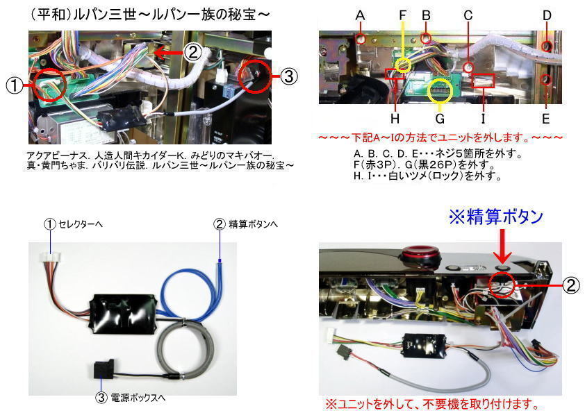 | 対応機種 コイン不要機リスト 〔④-5〕 | (平和) アクアビーナス.人造人間キカイダーK.バリバリ伝説.トップをねらえ2! 真・黄門ちゃま.みどりのマキバオー.ルパン三世~ルパン一族の秘宝~ ※他メーカー.他機種もございますので、ご遠慮なくお問い合わせください。 |