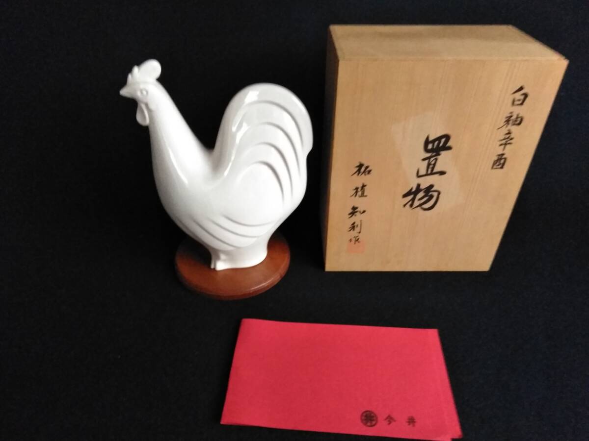 柘植知利作 白釉辛酉 とり 酉 鳥  木箱付  縁起物 招福 干支(A-29)