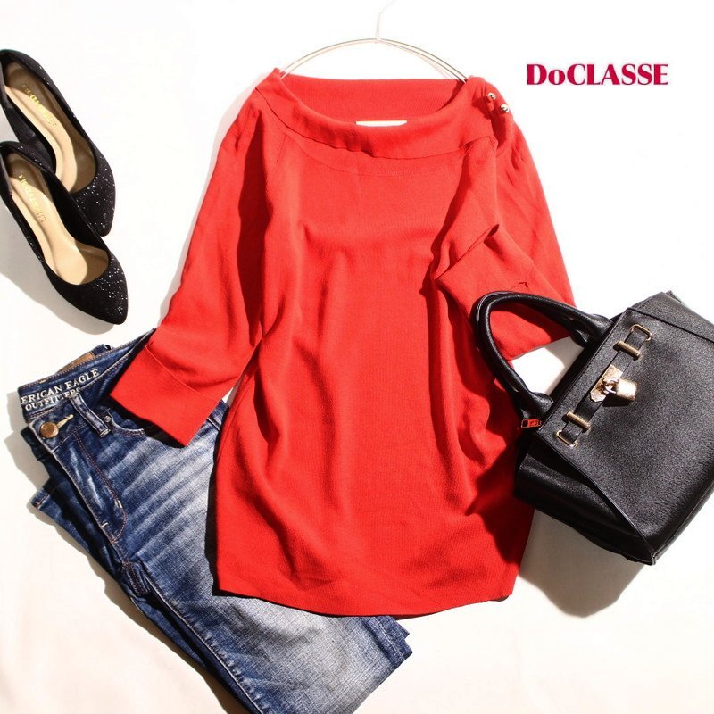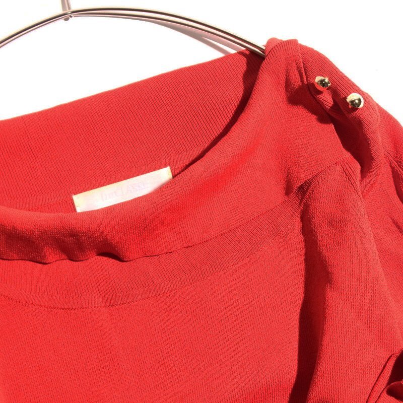 美品 DoCLASSE ドゥクラッセ 春 サマーニットカットソー L 七分袖 オレンジ 赤 レーヨン ストレッチ ミセス オフィス 通勤 お洒落着 上品