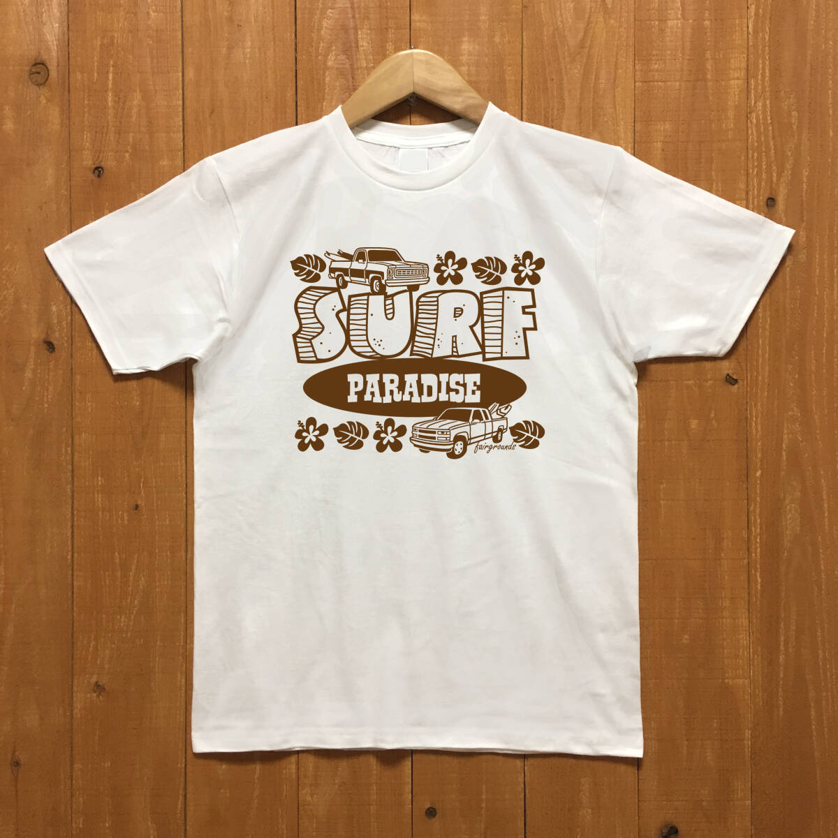 ■SURF PARADISE Tシャツ■XLサイズ(ホワイトxブラウン)アメリカ アメ車 サーフィン シボレー ハワイ CHEVROLET HAWAII CHEVY