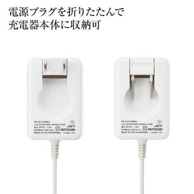 未使用時は電源プラグを折りたたんで充電器本体に収納可。持ち運びに便利な180度回転する電源プラグ。