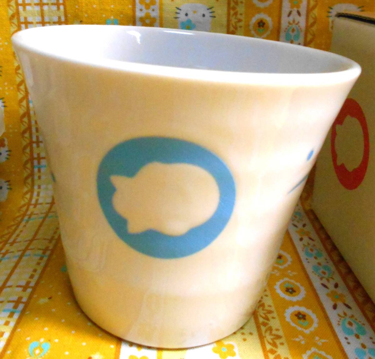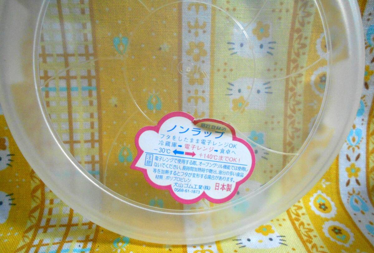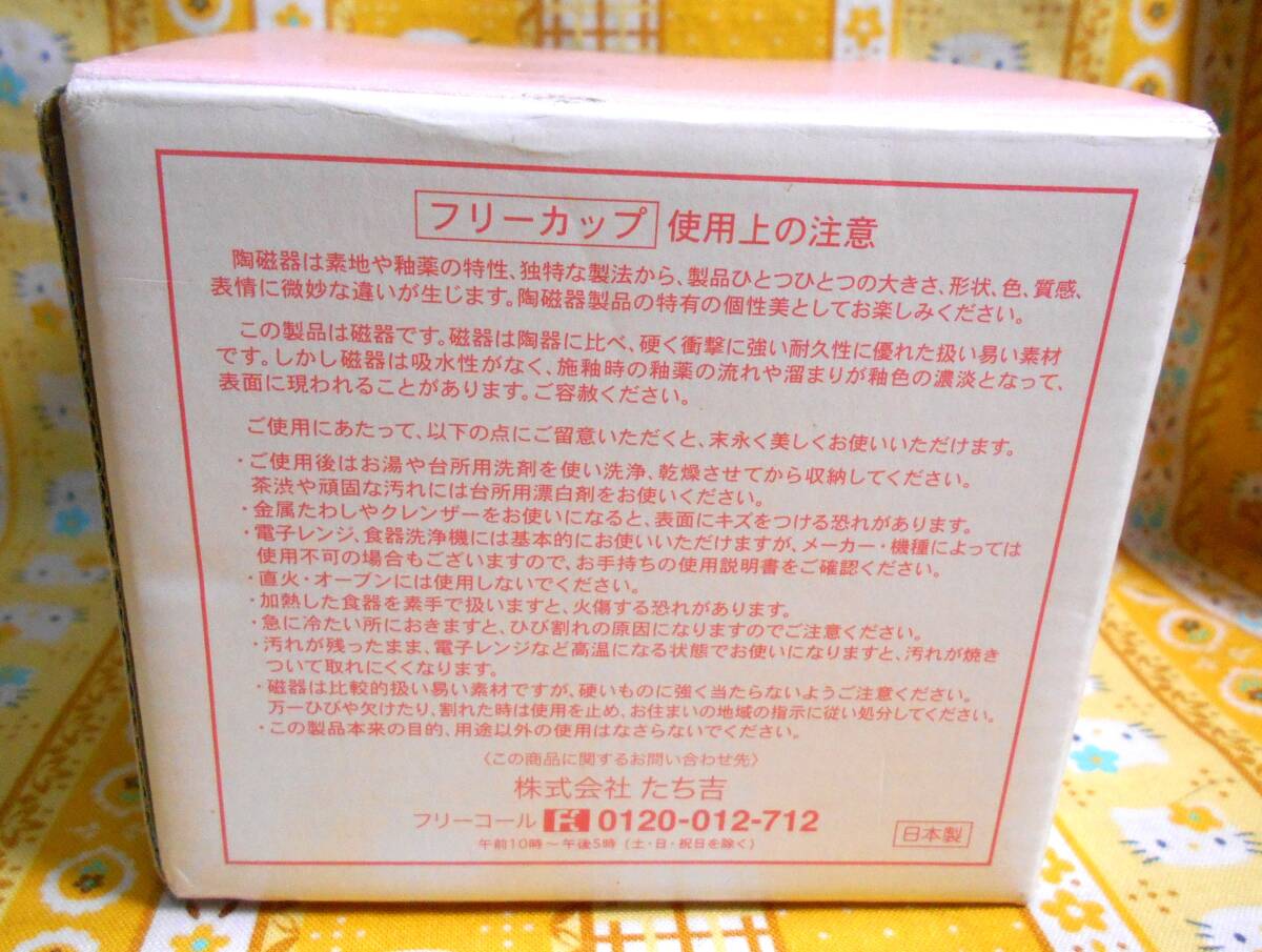 蓋付きの保存容器が蓋が付いた状態で上部の直径11cm、高さ5.5cm、湯呑みが上部の直径9.3cm、高さ9cmほどの大きさです。箱は湯呑みのピンク一つだけです。とても絵柄の可愛いお品です。保存期間が長いお品になりますので布巾で拭いています。