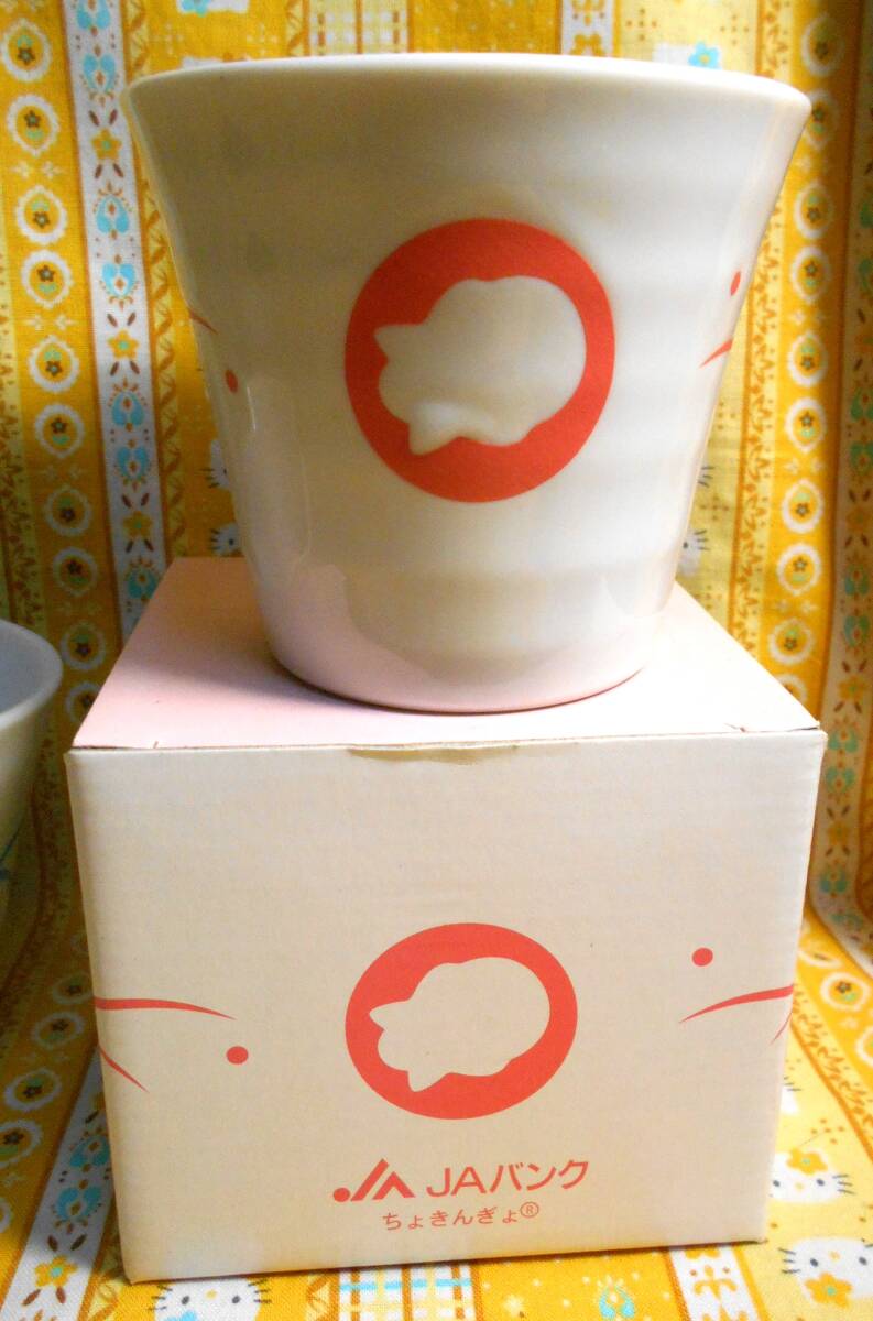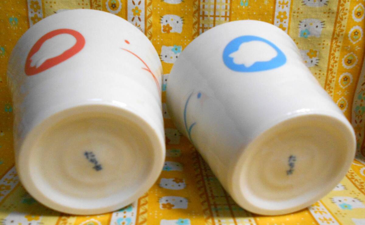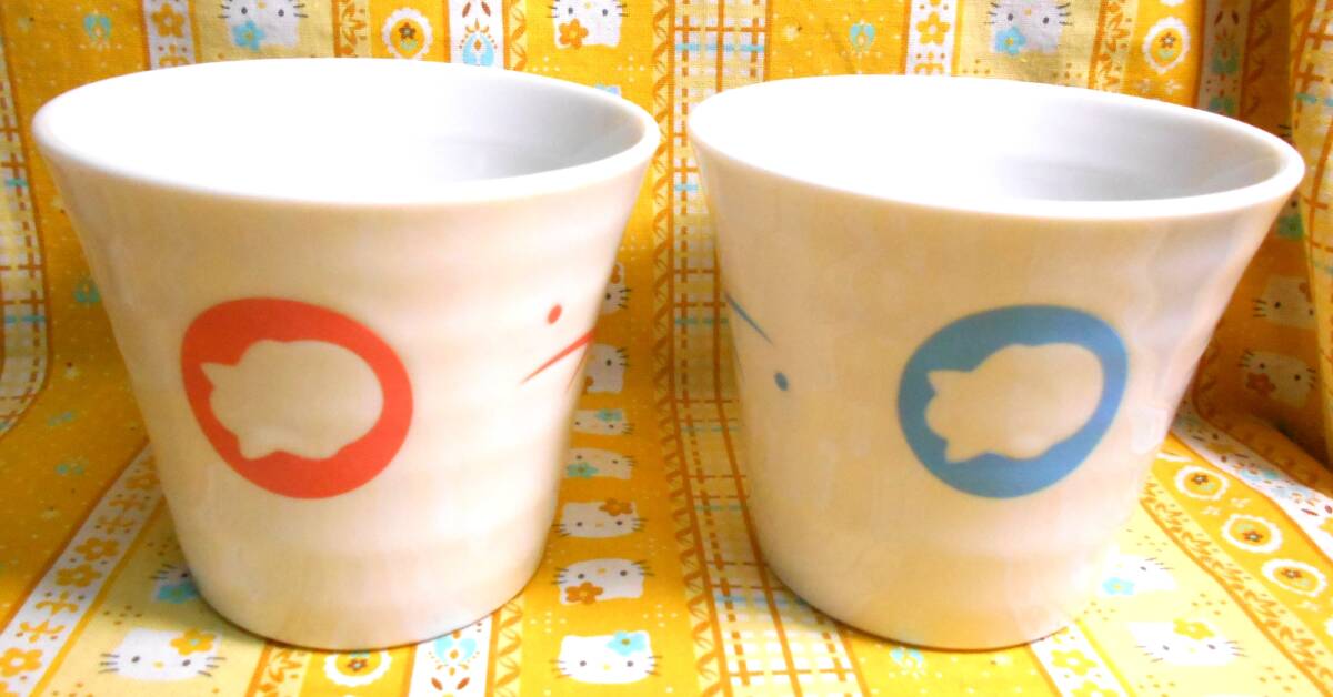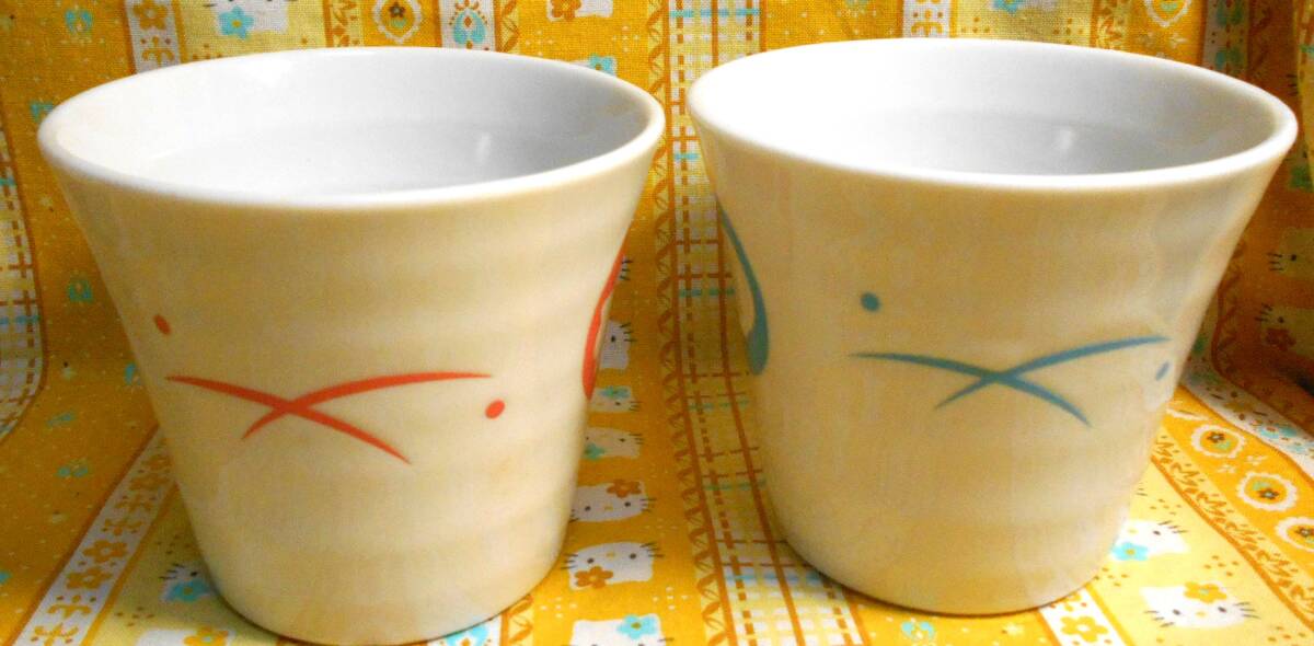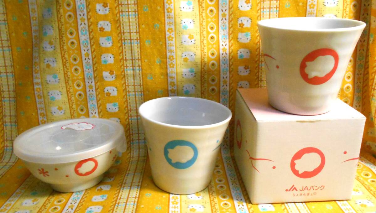 ♪ちょきんぎょ新品シルエット柄陶器製食器3個セット蓋付オンンラップ保存容器小鉢&湯呑みタンブラー青&ピンク