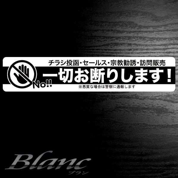 しつこい迷惑で悪質な訪問者に一切お断りステッカー! セールスマン、防犯対策、訪問販売、宗教勧誘、新聞勧誘、NHKに効果てきめん! ポストやインターフォン、玄関ドア付近にご利用ください。 ◎この商品は文字変更・サイズ変更ができません◎ 落札価格は1枚の価格です。 ●サイズ:縦30mm×横150mm ●耐候年数:3~5年 ●UV加工、防水加工 |