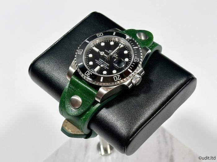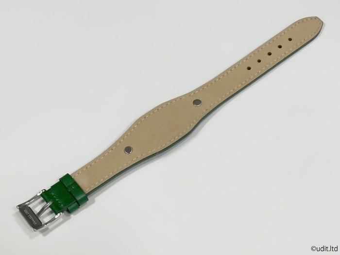 こちらはマット付き一体型の腕時計用ベルトで、リベット打ちが施された武骨なデザインが特徴です。