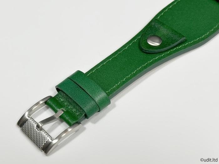 このレザーベルトは、ビンテージやミリタリースタイルの時計にもよく合い、腕元に独特の存在感をプラスします。