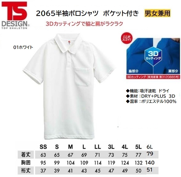 [ネコポス発送/1枚]★TSDESIGN 2065半袖ポロシャツ ポケット付き【01ホワイト・5Lサイズ】定価3000程度の品、即決880円!!