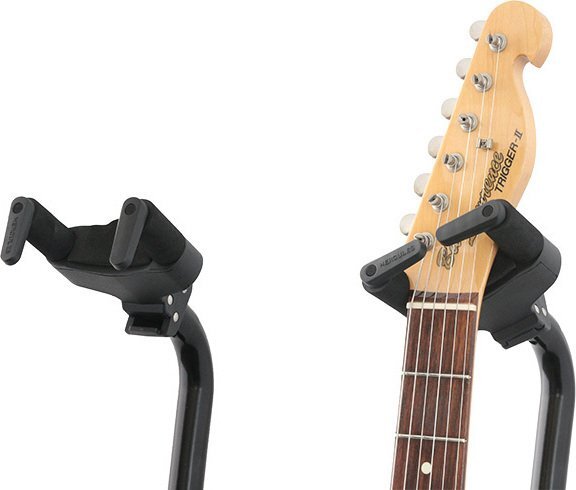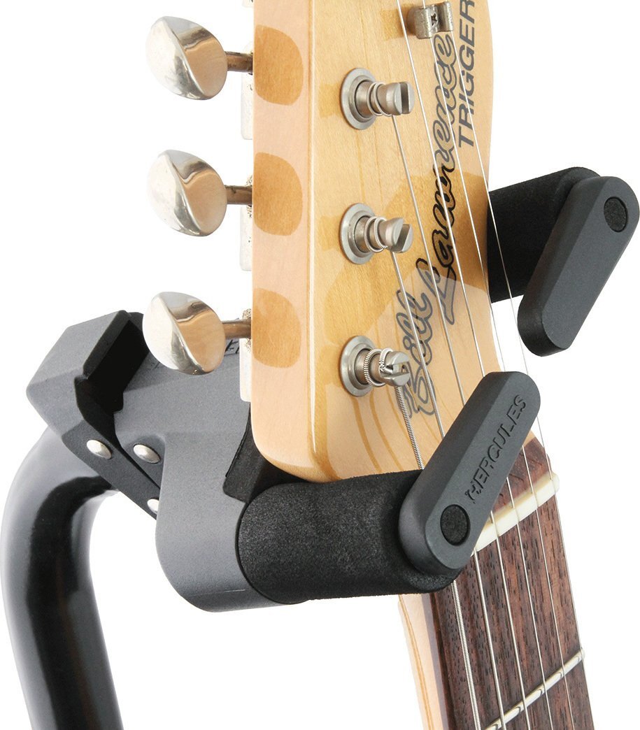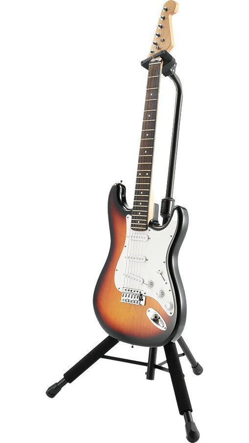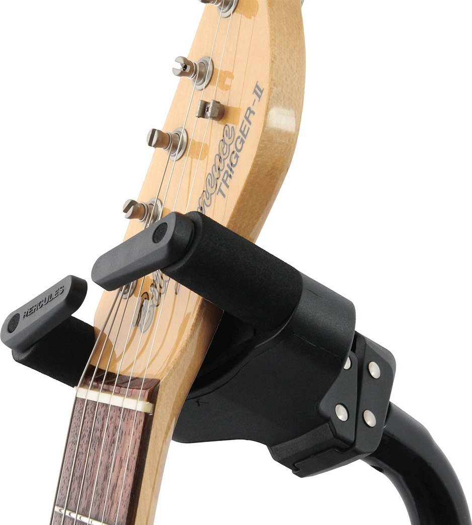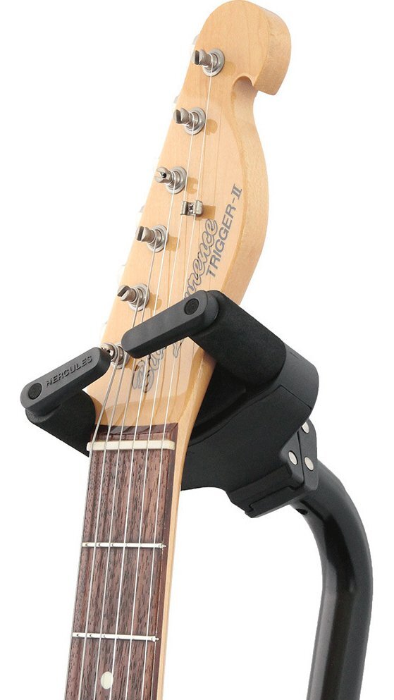 | GS414BSWは、GS414B PLUSにAS Yoke(オート・スイベル・ヨーク)の機能を追加した日本限定仕様のギタースタンドです。 HERCULES GSPシリーズ・ウォールハンガーのように、ネックハンガー部分がヘッドの形状に合わせて回転するため、左右非対称のヘッドにもフィットし、よりギター本体に負荷をかけることなくロックすることができます。 ネックハンガーのホールド部分は、40mm~52mm(1.57インチ~2.05インチ)幅のネックに対応するよう設計されています。また、付属のNINA(ナローネック・インストゥルメント・ネック・アジャストメント)を使用することで、細身のヘッド形状のギターやウクレレなど28mmまでの細いネックにも対応可能です。 従来のGS414B PLUSと同様に、オートグリップシステム(AGS)やインスタント・ハイト・アジャストメント・クラッチを採用しているため、楽器の取り外しや高さ調整をワンタッチで行うことができます。さらに、楽器に触れる部分にはスペシャル・フォーミュレイテッド・フォーム(SFF)を使用し、楽器へのダメージを防ぎます。 オートグリップシステム(AGS) 楽器の重さを利用してアームが回転することで、ネックを掴むように楽器を安全にロックします。 左右非対称のヘッド形状にも対応 楽器を安全に固定しながらヘッドの形状に合わせて角度を調整することが可能。左右非対称のヘッド形状にも対応します。 付属アタッチメント(NINA) 付属のNINA(Narrow Instrument Neck Adjustment)をアームに取り付けることで、幅28mmまでの細いネックの楽器にも対応します。 簡単に高さ調整が可能なアジャストメント・クラッチ 新採用のAdjustment Clutch(アジャストメント・クラッチ)は、軽く押すだけで素早くかつ簡単にスタンドの高さ調整を可能にしています。 特別配合のフォームパッドスペシャル・フォーミュレーテッド・フォーム・ラバー SFF(Specially Formulated Foam Rubber)ラバーを採用。楽器の塗装面を化学変化によるダメージから守ります。 ※ラッカー塗装には対応しておりません。 製品仕様 製品タイプ:ギター&ベーススタンド 本数:1本 高さ:950mm~1,150mm 重量:1.8kg 耐荷重:15kg 設置面スペース(半径):310mm 折りたたみサイズ:710mm×155mm×110mm 付属品:N.I.N.A.(1ペア) |