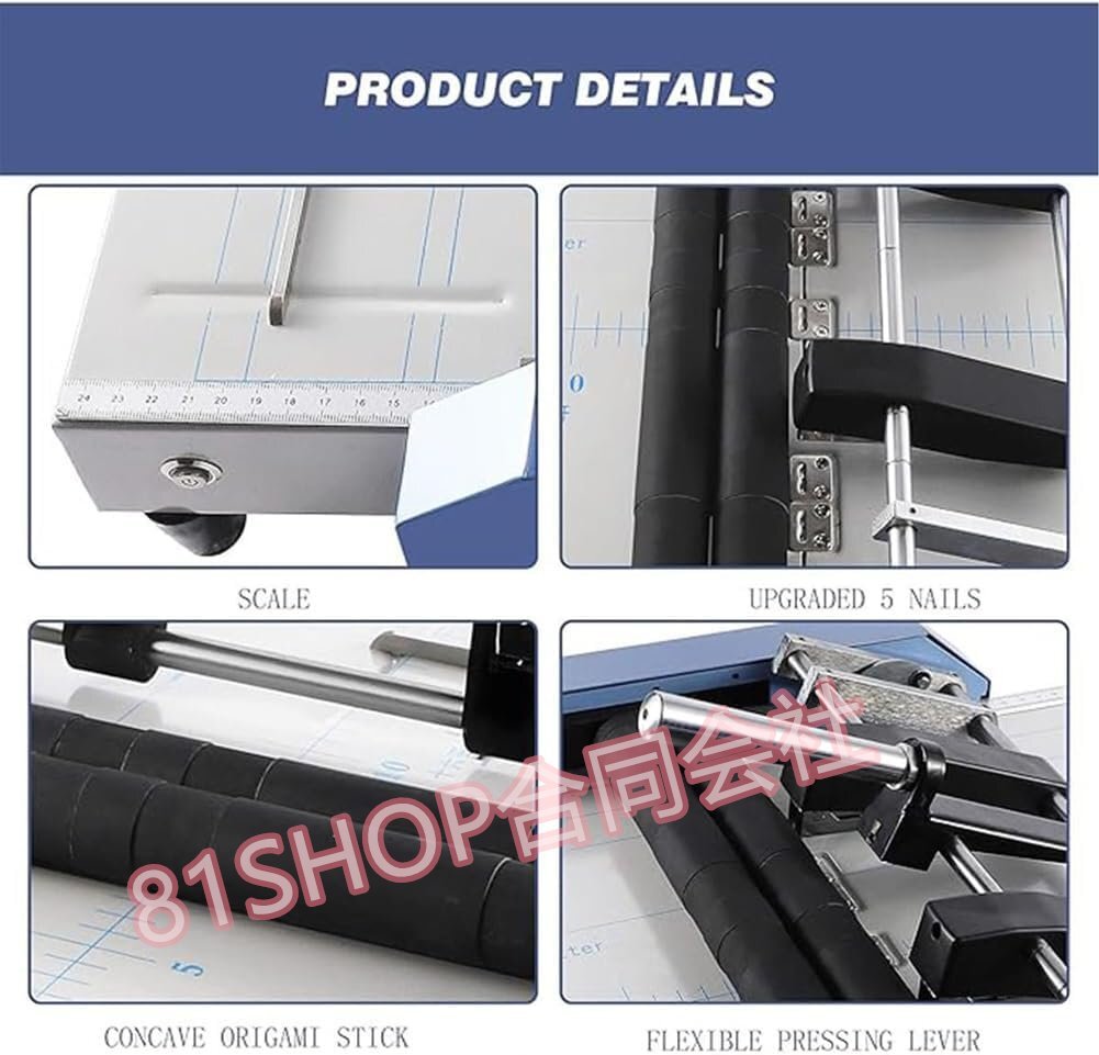 最大用紙サイズ:317X440MM (A3)、厚手の綴じ用紙:70グラムの20枚。取り外し可能な位置決めロッド、綴じ定規、取り外し可能な綴じストッパーは、さまざまな用紙サイズのニーズを満たします。