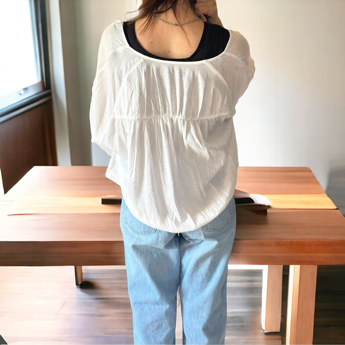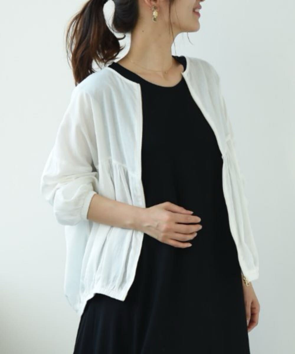 たっぷりと入っているギャザーがアクセントにもなり、春〜秋までお使いいただくのに最適な羽織アイテムです