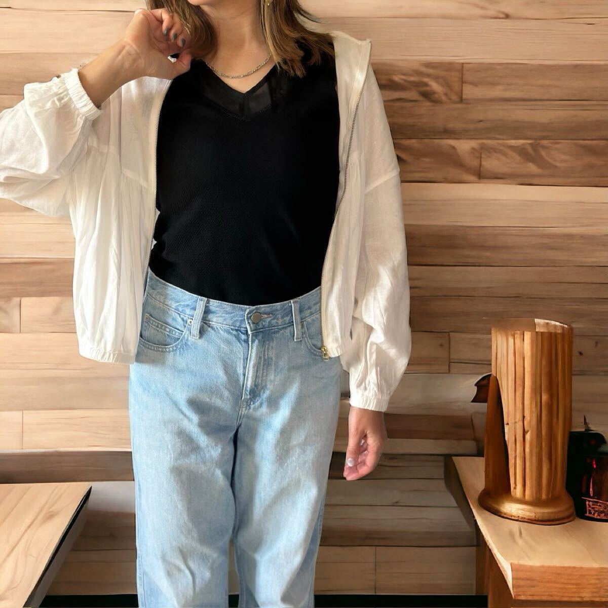 程よい透け感と落ち感がある、麻混素材のギャザーブルゾン。
