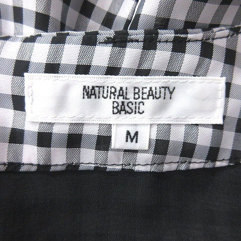 ナチュラルビューティーベーシック ワンピース ひざ丈 ギンガムチェック フリル 半袖 M 黒 ブラック 白 ホワイト レディース