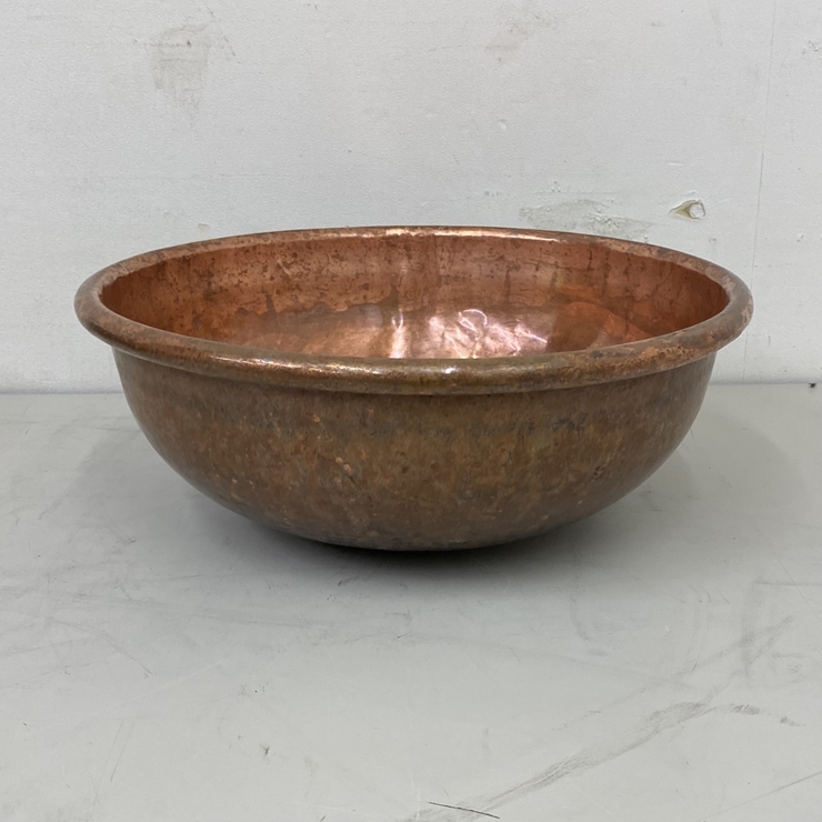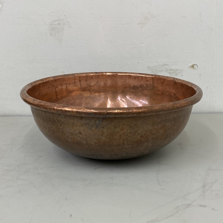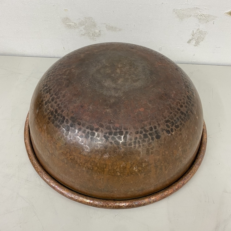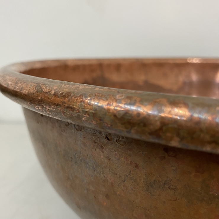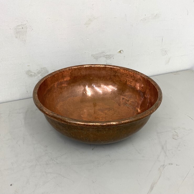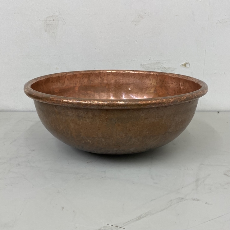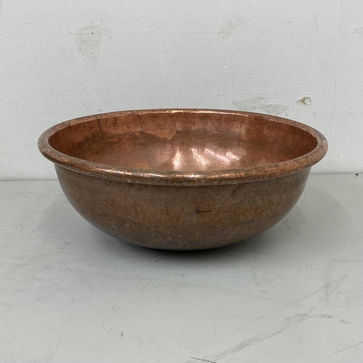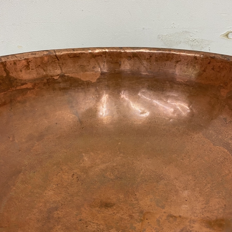 ◆備考:『銅は調理用品としては最も熱伝導に優れており、鍋にまんべんなく熱を伝え鍋全体が熱くなるので、料理を均一に調理することが出来ます。銅鍋は、焦げやすいジャム作り・飴作り・餡作りなどに適しています。』←インターネットより引用、 キズ・シミあり、 ヘコミあり