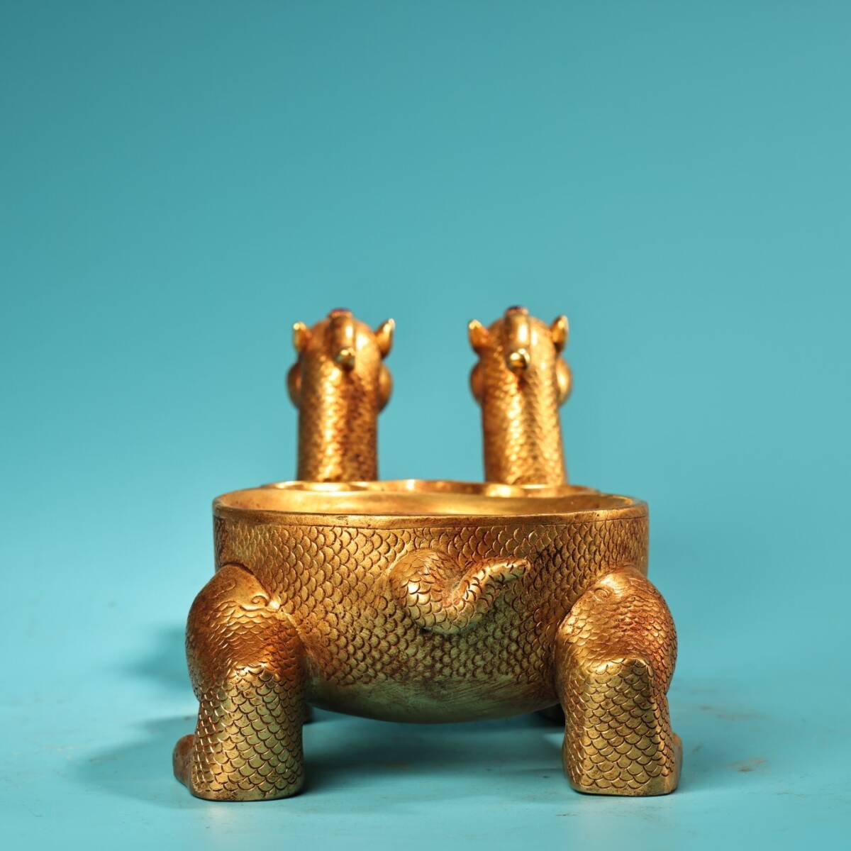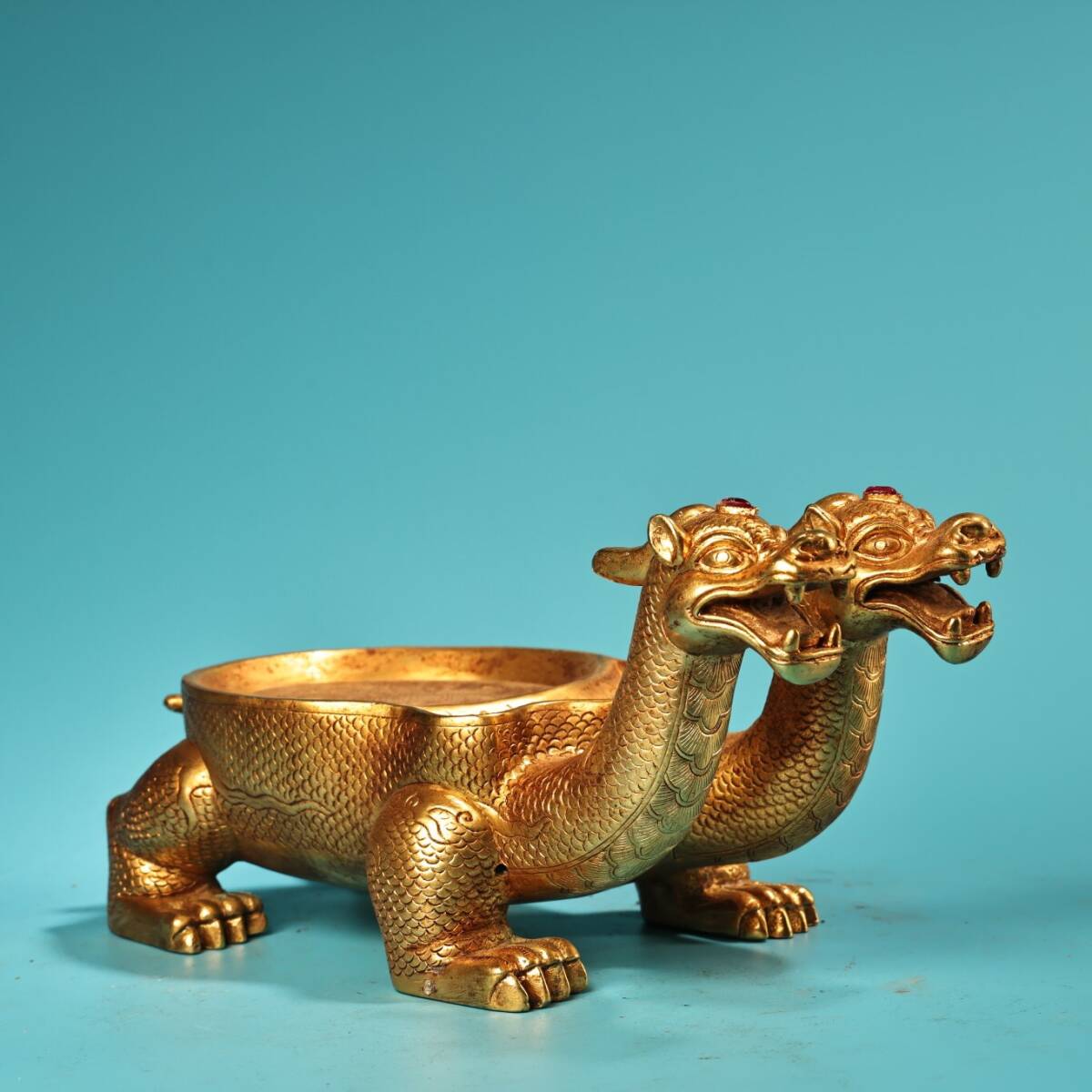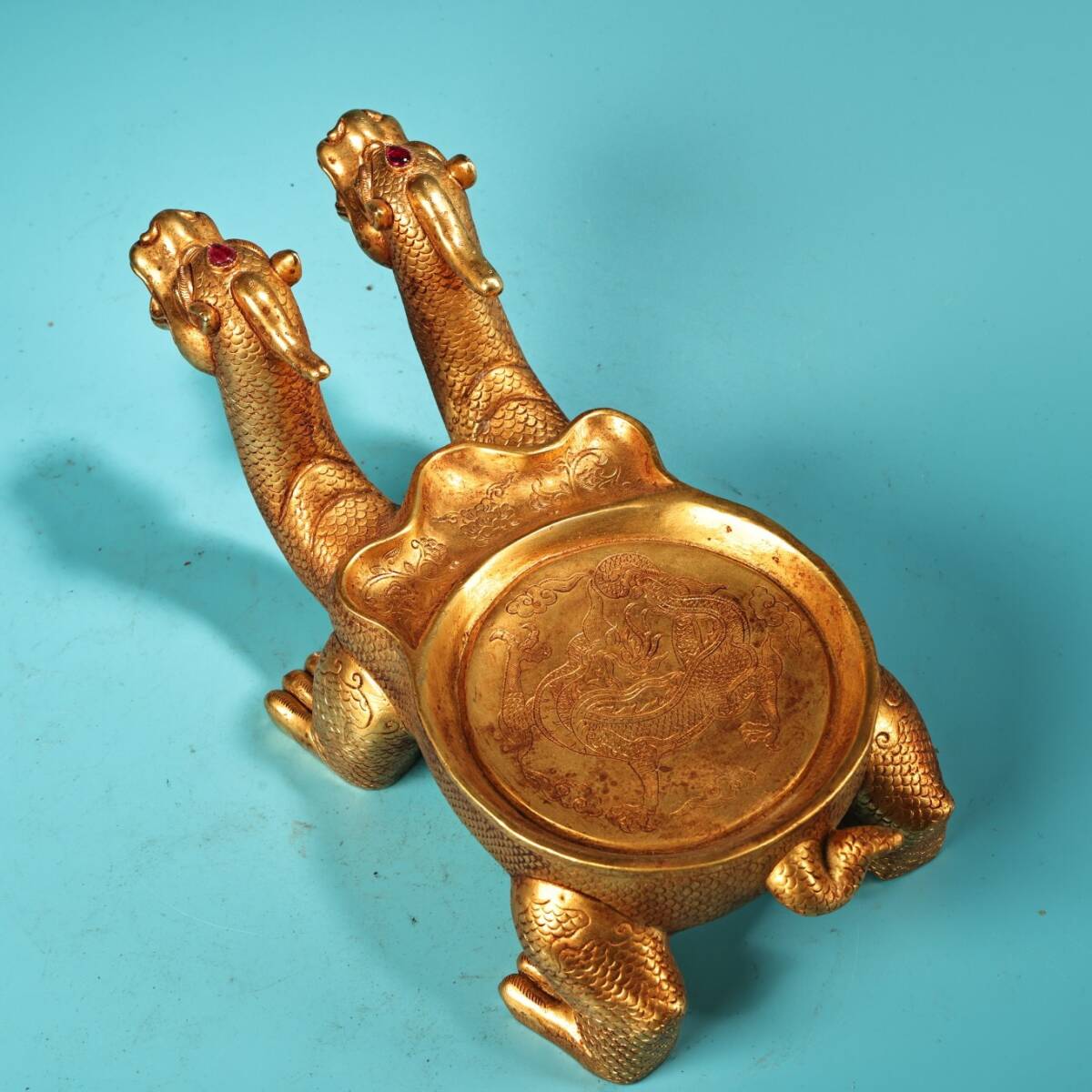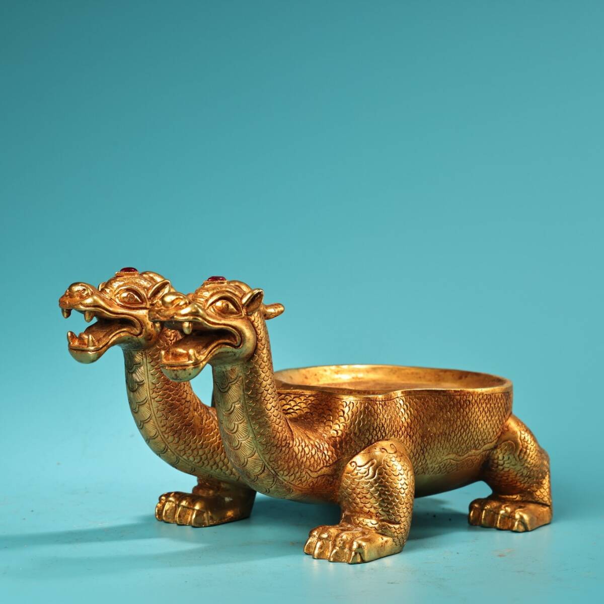 【超珍館蔵】銅製 塗金 雙頭龍龜筆洗 置物 賞物 古賞物 古董品 古美術品 時代物 旧家蔵出 稀少珍蔵品