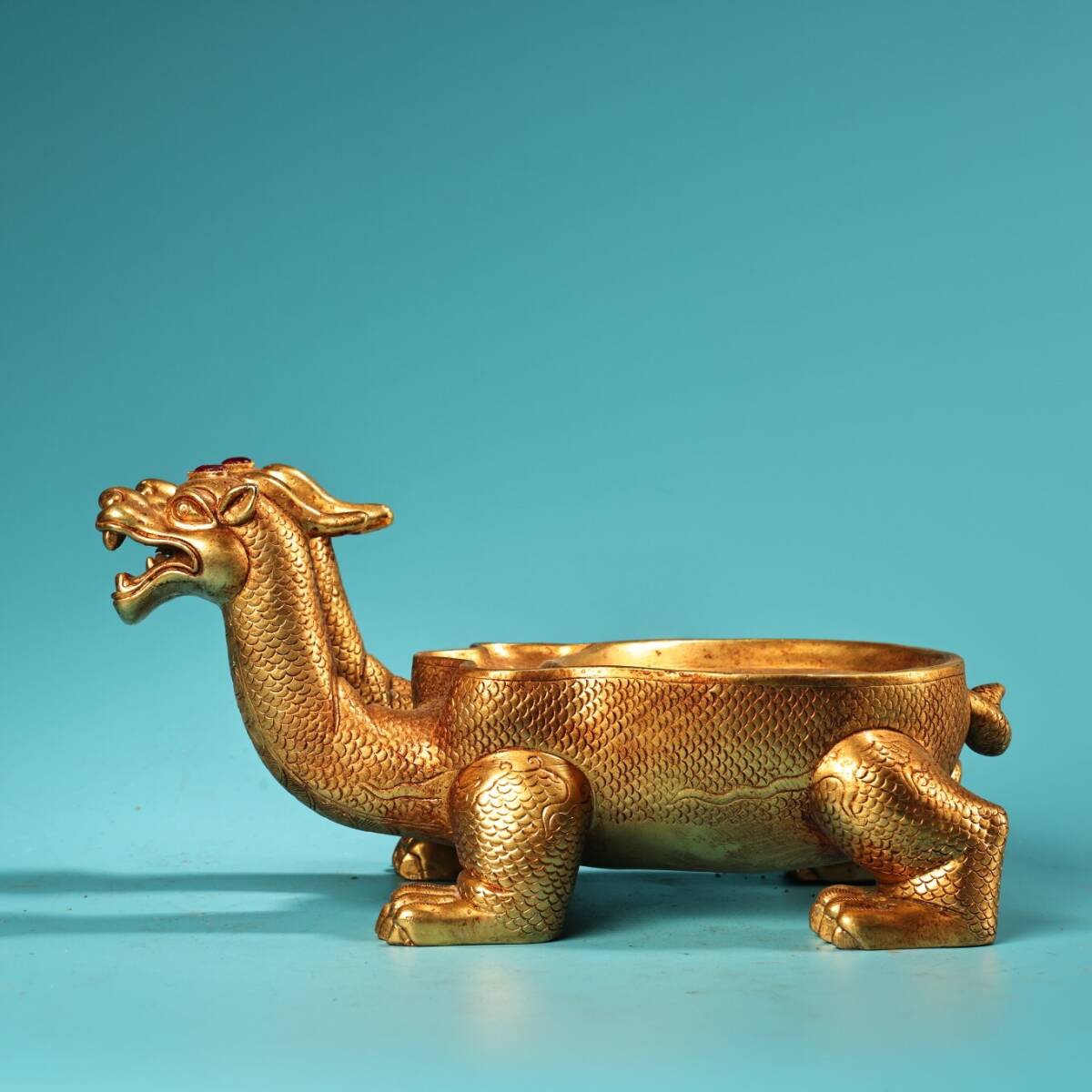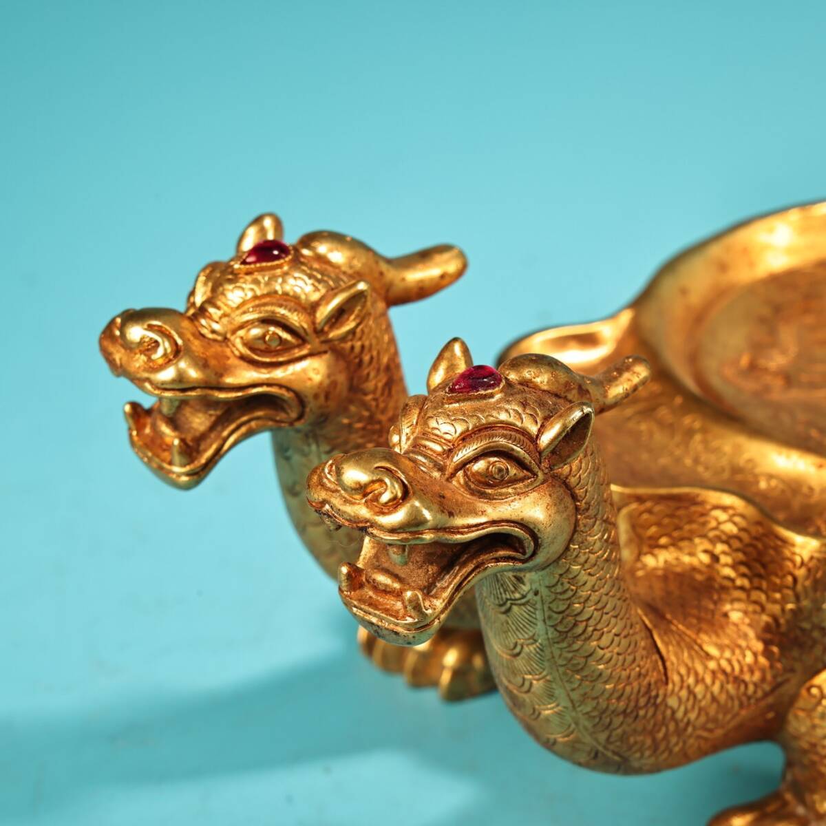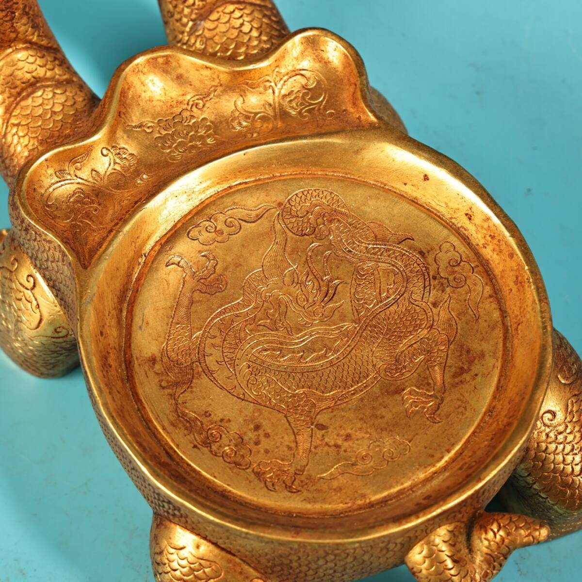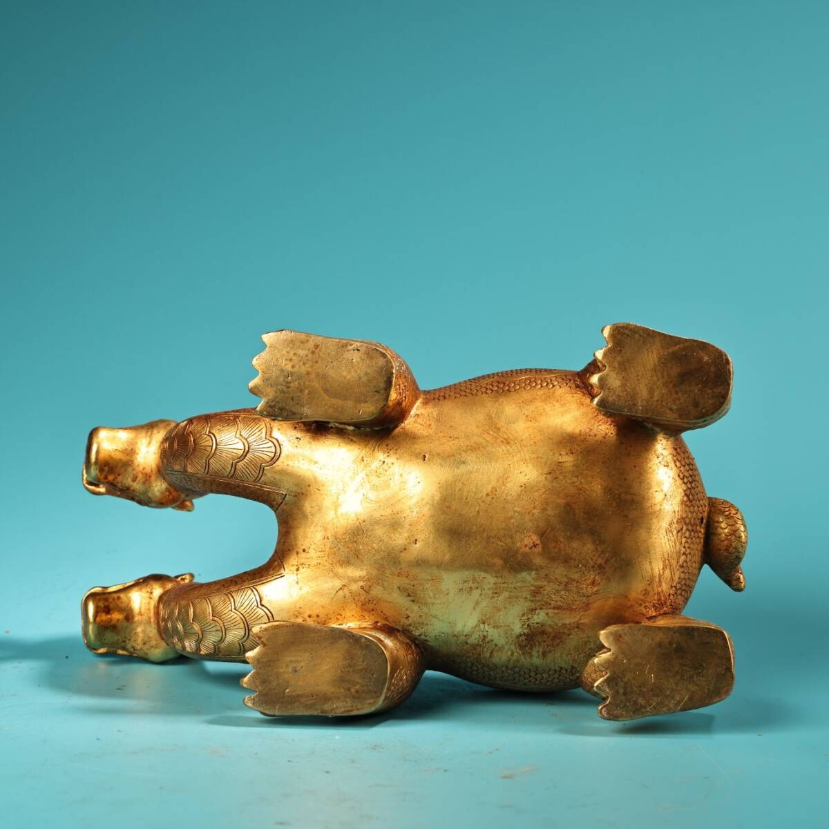 【超珍館蔵】銅製 塗金 雙頭龍龜筆洗 置物 賞物 古賞物 古董品 古美術品 時代物 旧家蔵出 稀少珍蔵品
