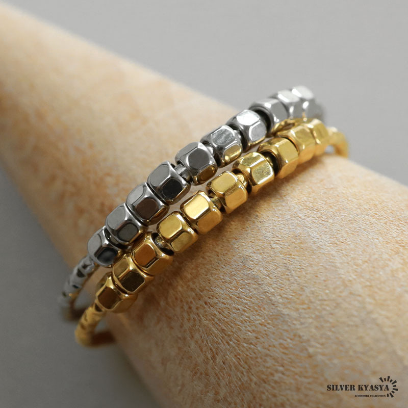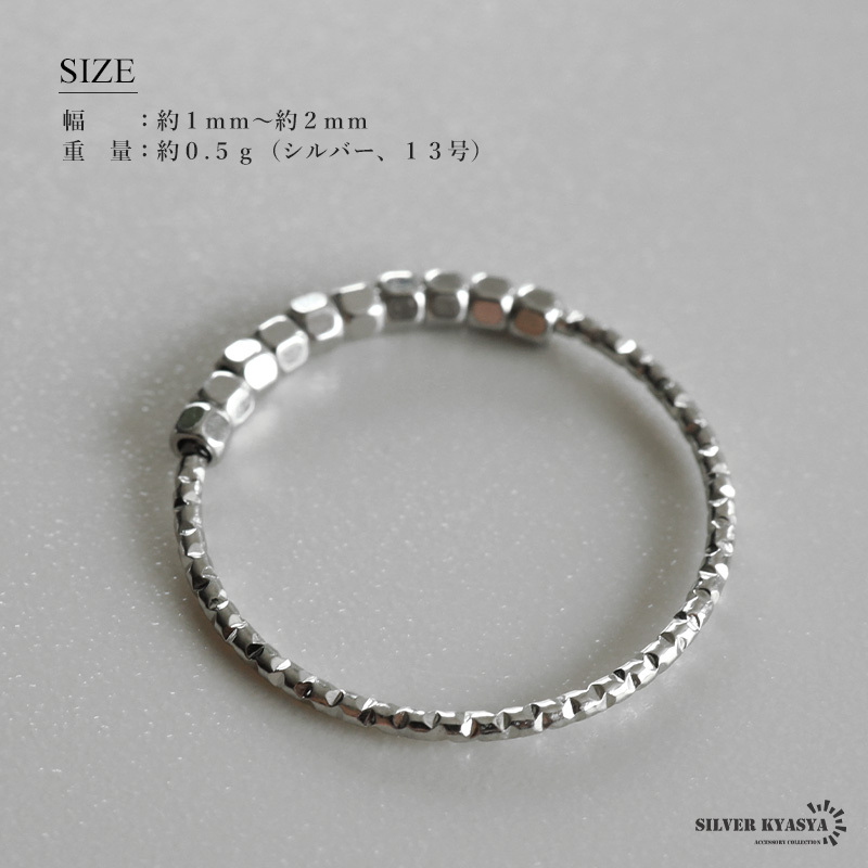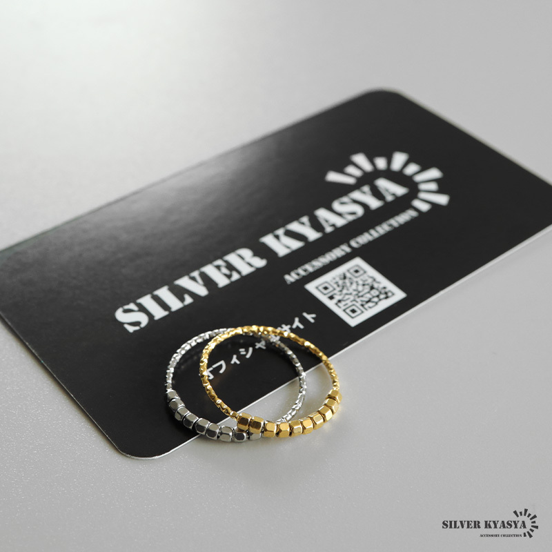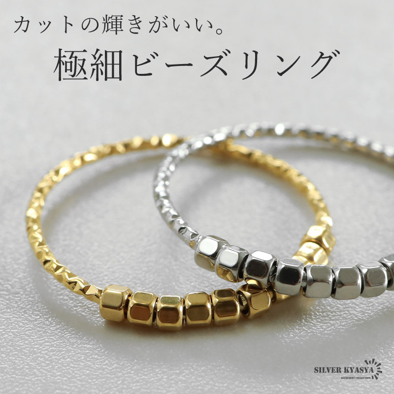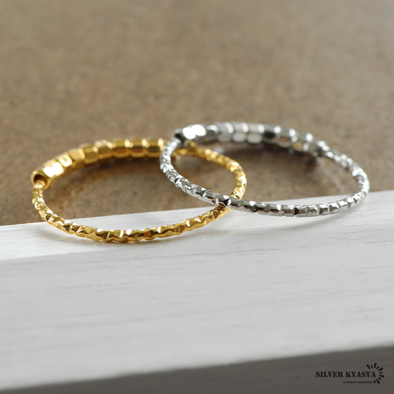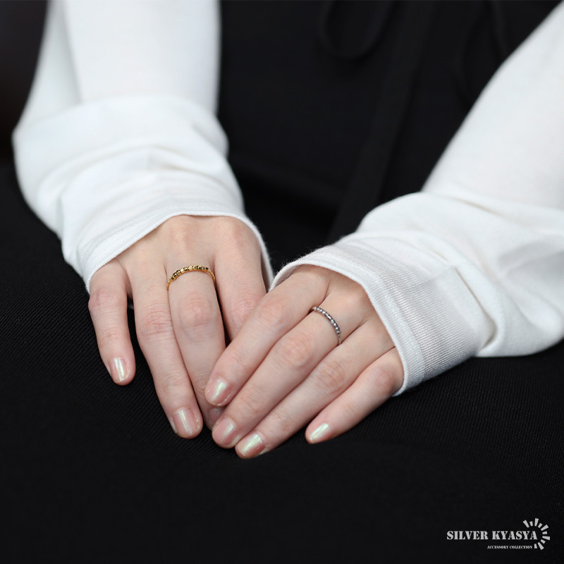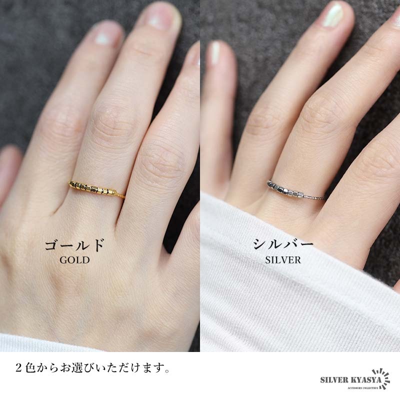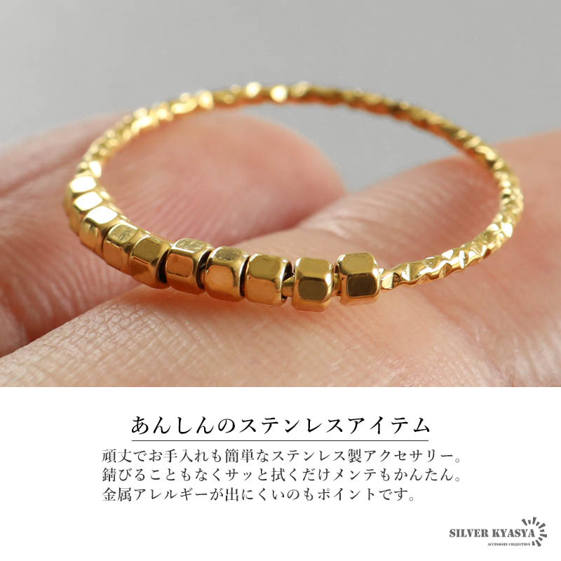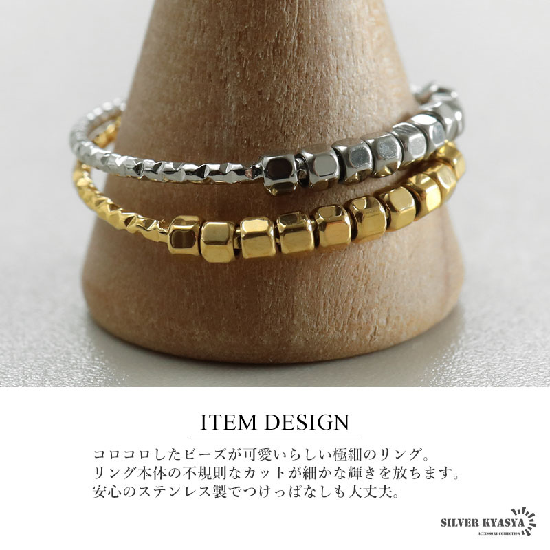 コロコロしたビーズが可愛いらしい極細のリング。リング本体の不規則なカットが細かな輝きを放ちます。安心のステンレス製でつけっぱなしも大丈夫。