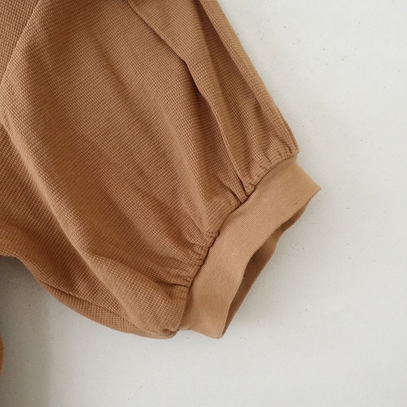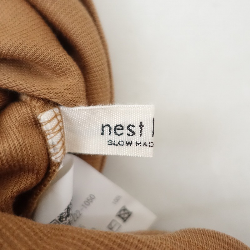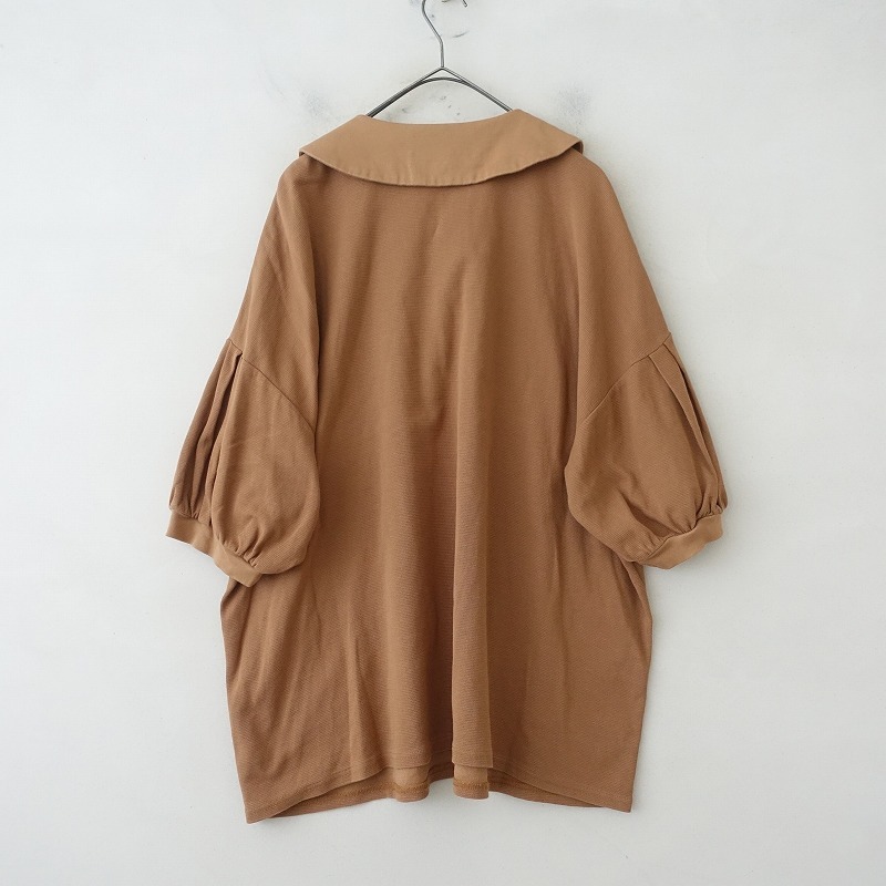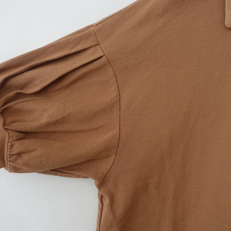 | nest Robeのコットンサーフニットポロシャツです。カラーはブラウンで、細かな凹凸のある薄手のニット地です。パフスリーブデザインで、フロント半開ボタン付きのプルオーバータイプで着脱できます。襟&ボタンラインは天竺ニット地に切り替えられており、袖口はリブ仕様です。定価(メーカー希望小売価格)17,600円の商品です。 |