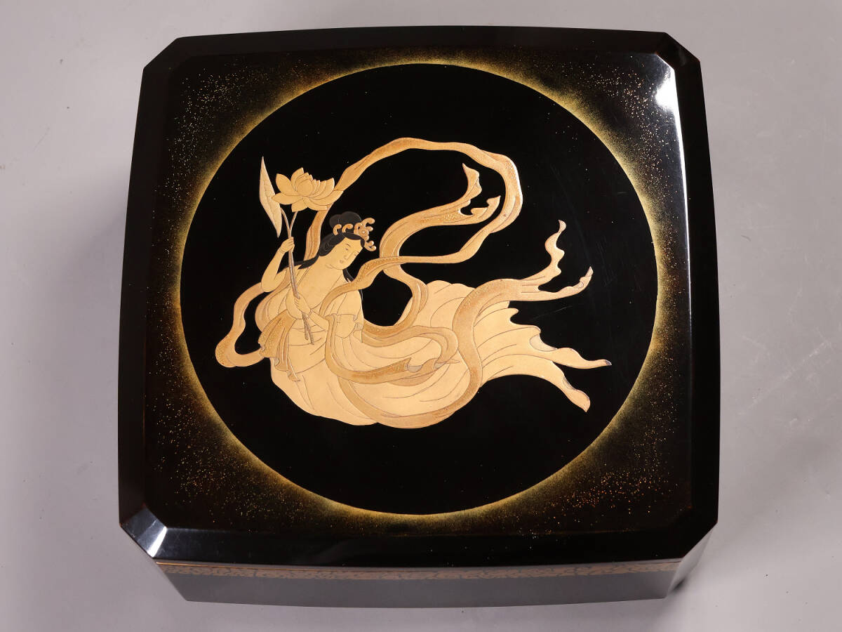 ◇時代物 飛天女 金蒔絵 饅頭箱 菓子箱 黒塗 木製 漆器 梨地 伝統工芸品 加賀蒔絵 金沢 明治期【MA824】◇