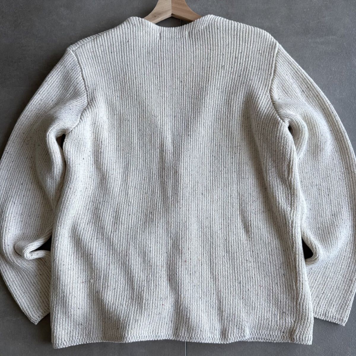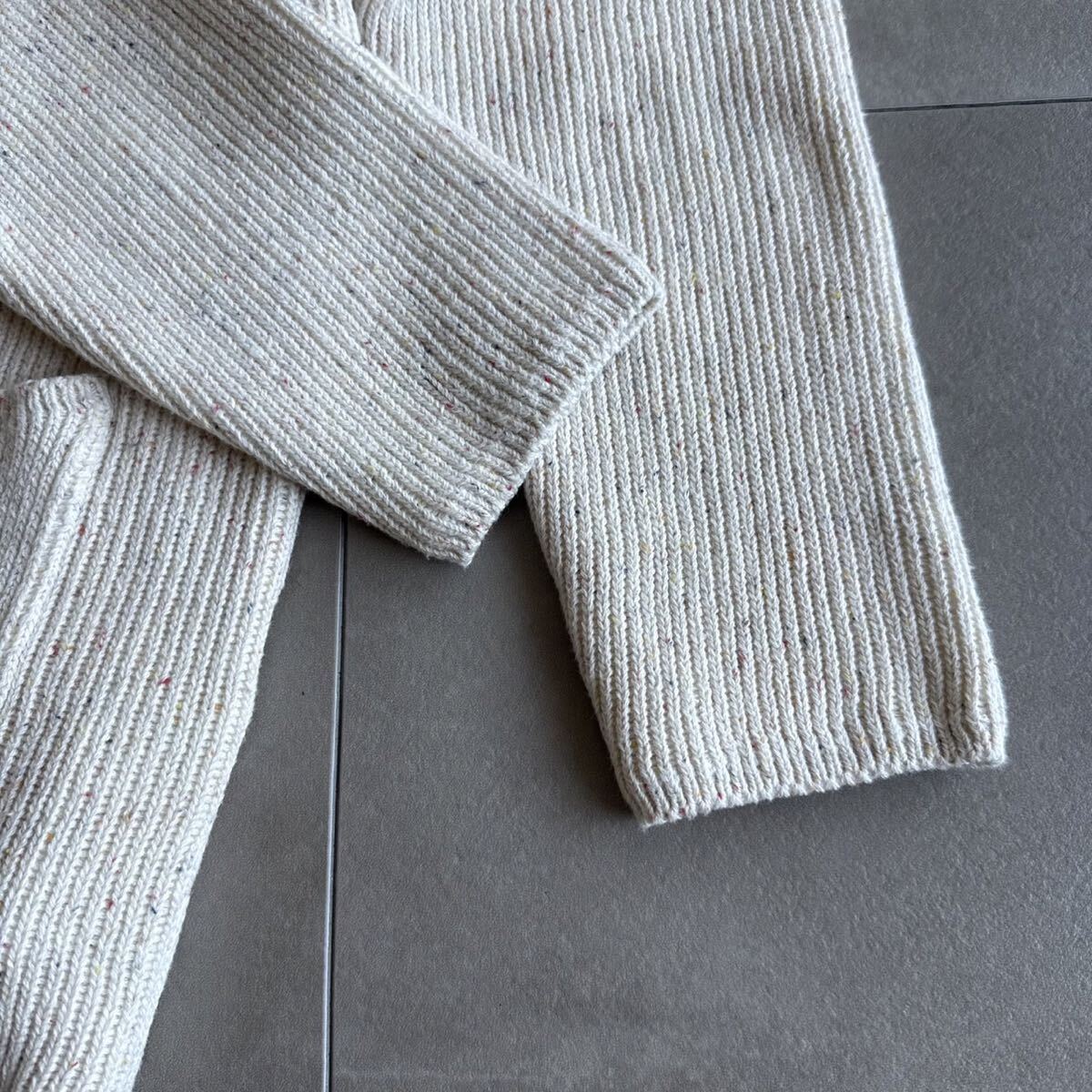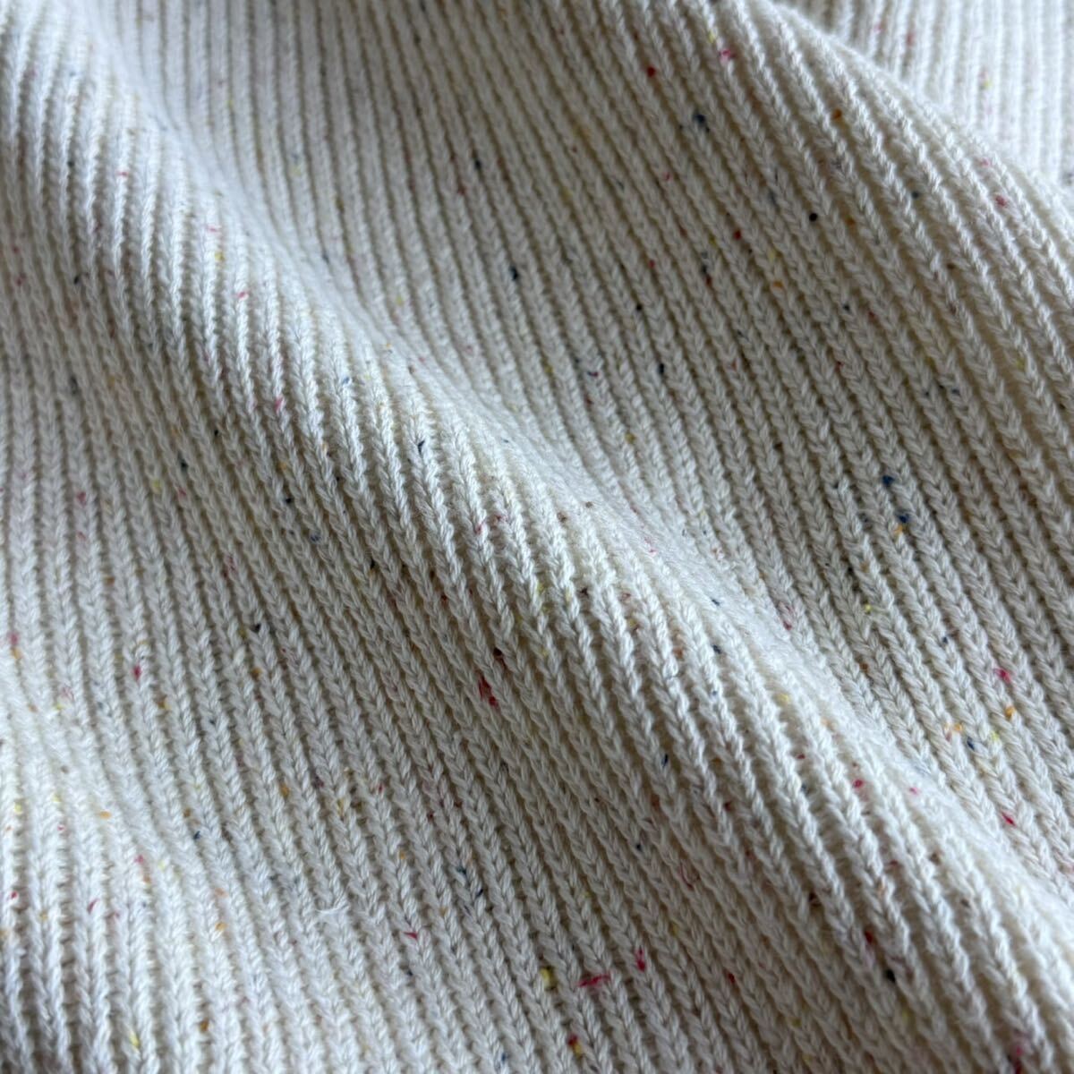 柔らかなコットン素材をベースにリブ編みで仕立てられ、ナチュラルな生成りのような上品なカラーが印象的。全体に散りばめられた多彩なネップ糸が遊び心を添え、シンプルながら奥行きのある表情を楽しめます。