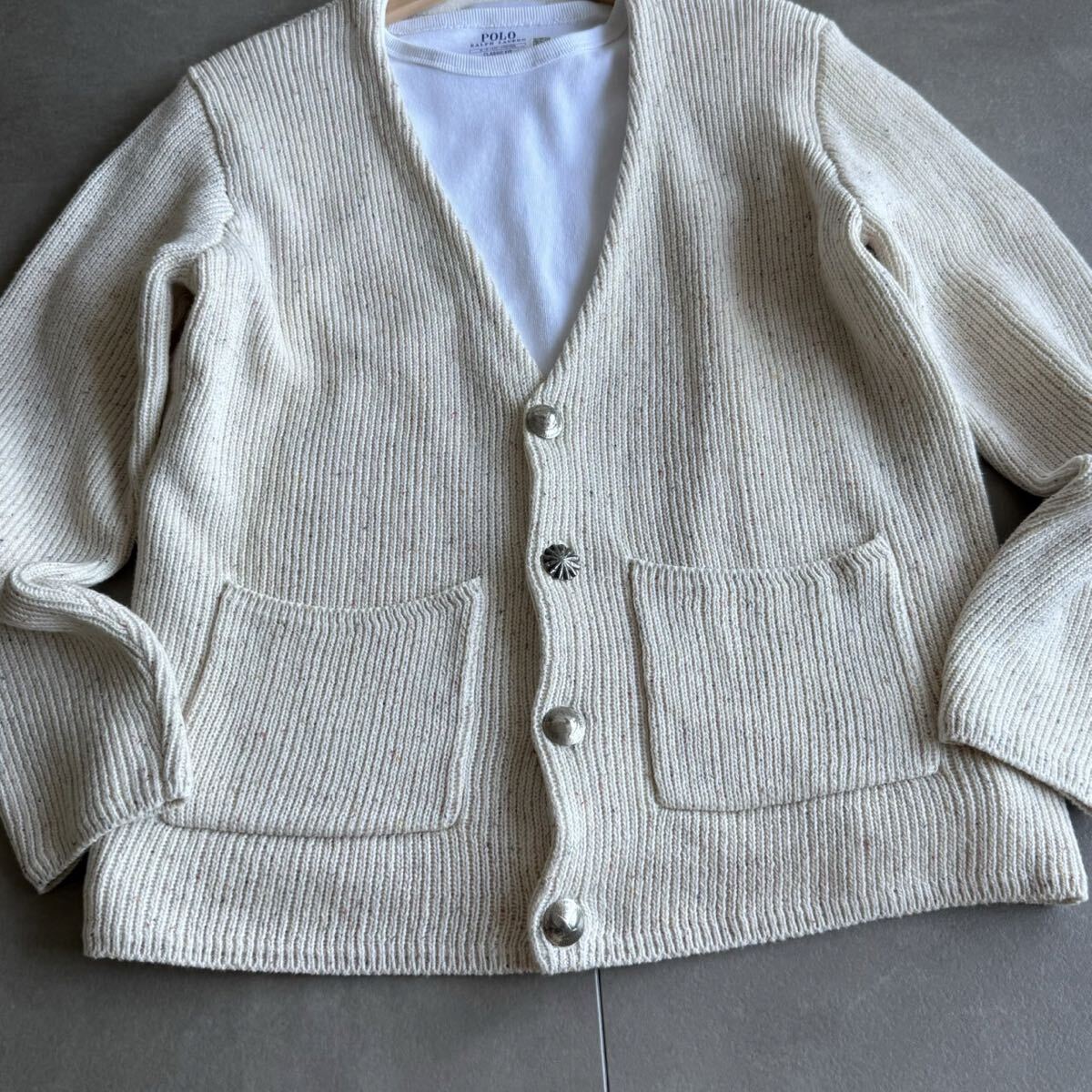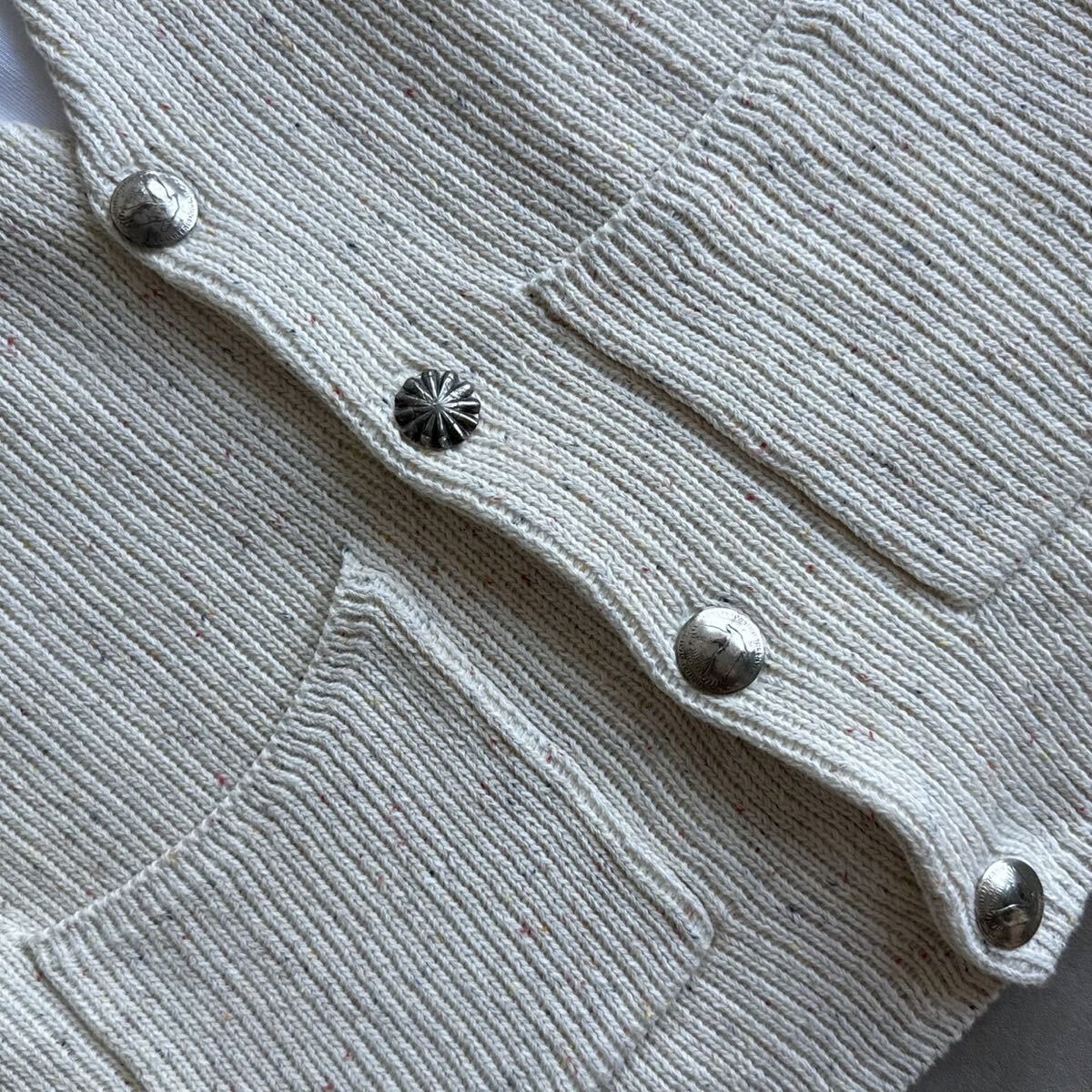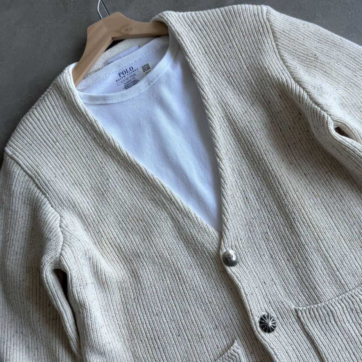 柔らかなコットン素材をベースにリブ編みで仕立てられ、ナチュラルな生成りのような上品なカラーが印象的。全体に散りばめられた多彩なネップ糸が遊び心を添え、シンプルながら奥行きのある表情を楽しめます。