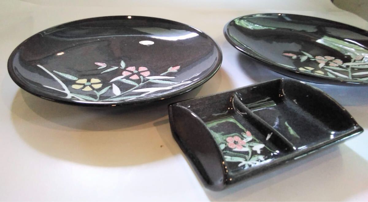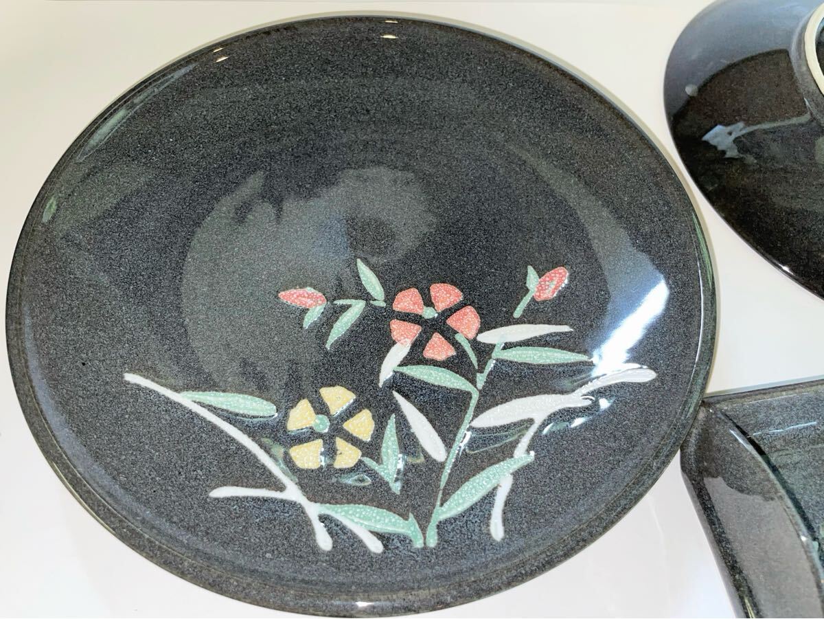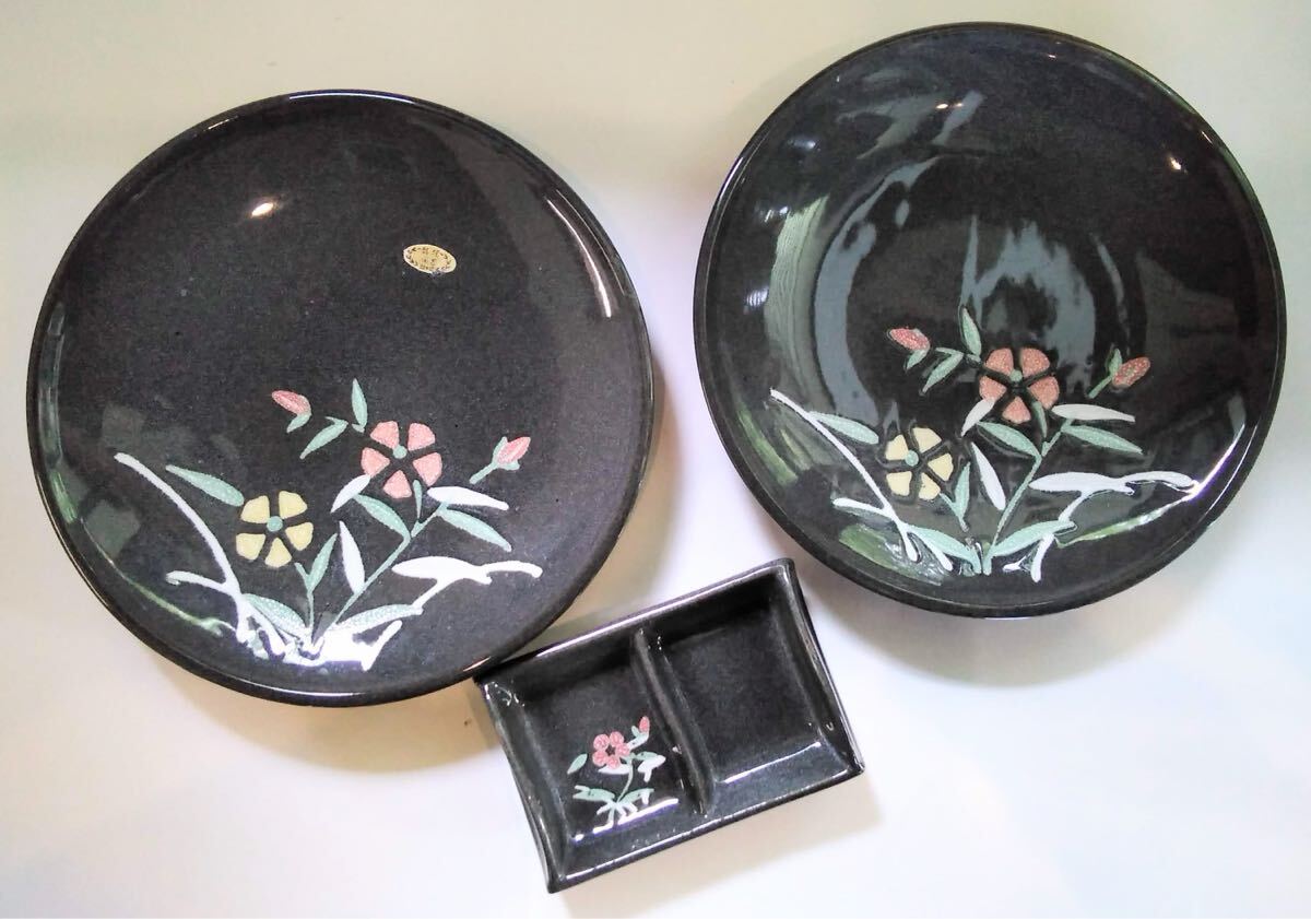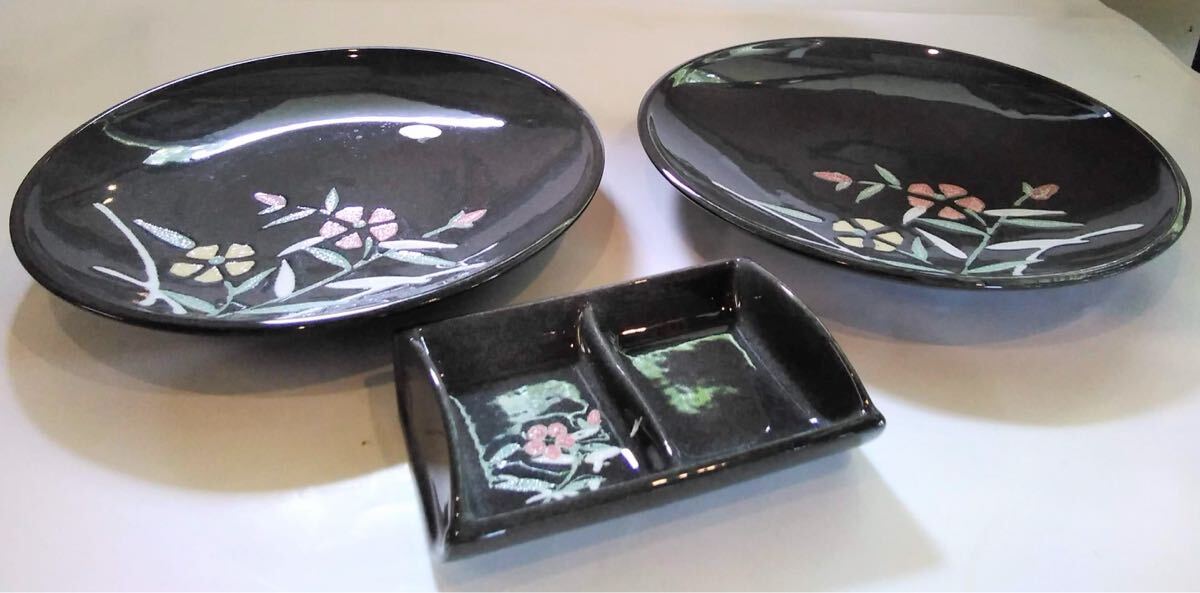 灰色黒 特選陶器 大皿 花絵 【大皿X2枚 &薬味入れX1】陶器