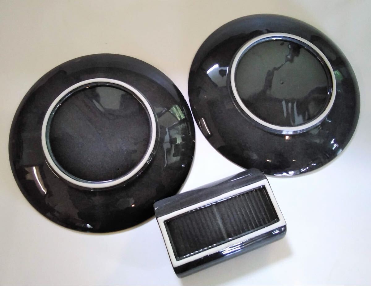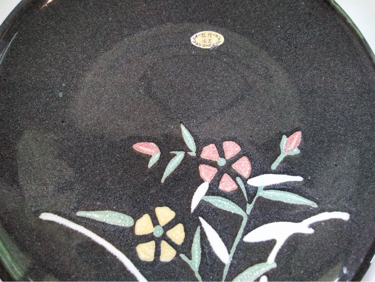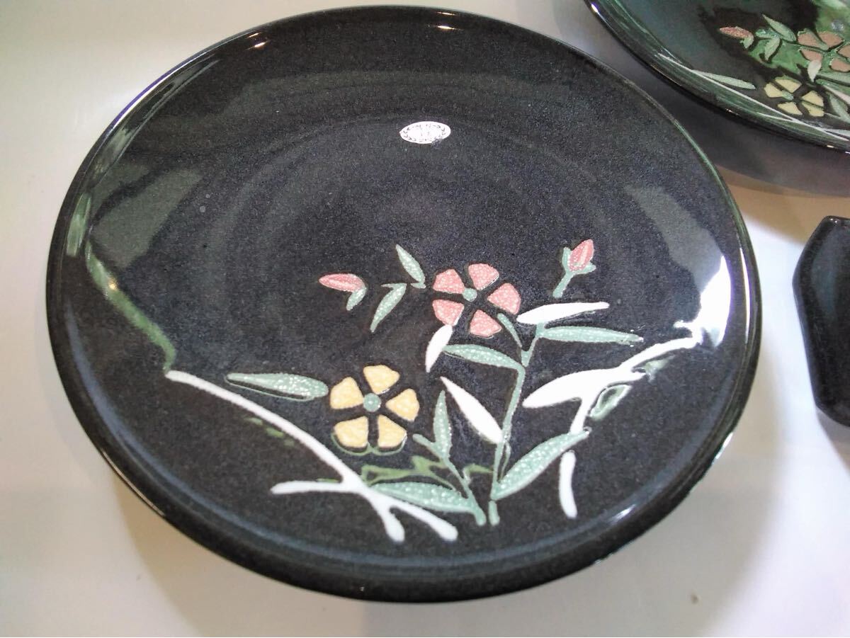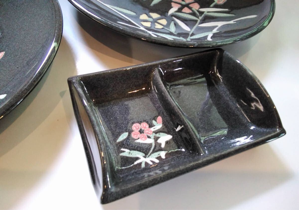灰色黒 特選陶器 大皿 花絵 【大皿X2枚 &薬味入れX1】陶器