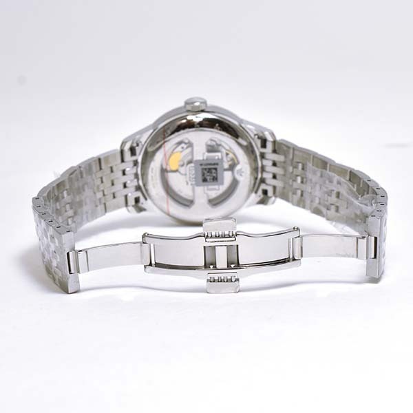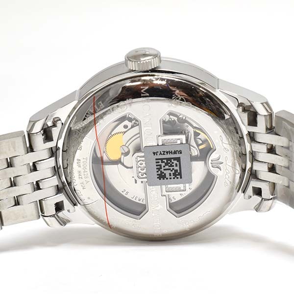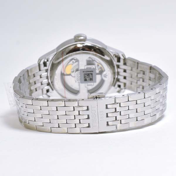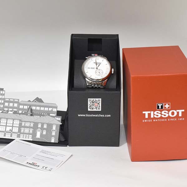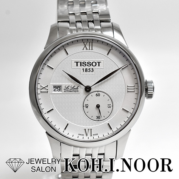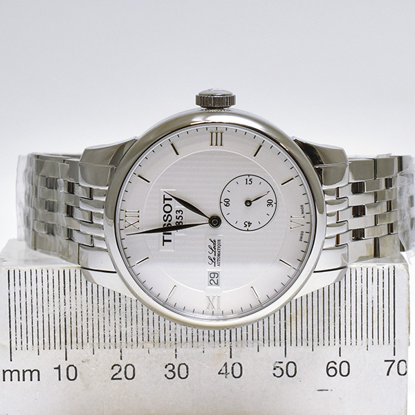 ホワイト文字盤にデイト表示とスモールセコンド表示を配したティソの自動巻きメンズウォッチ。未使用品。
