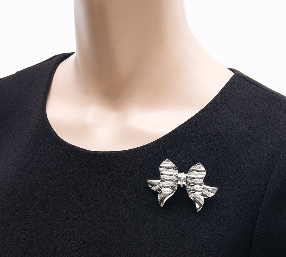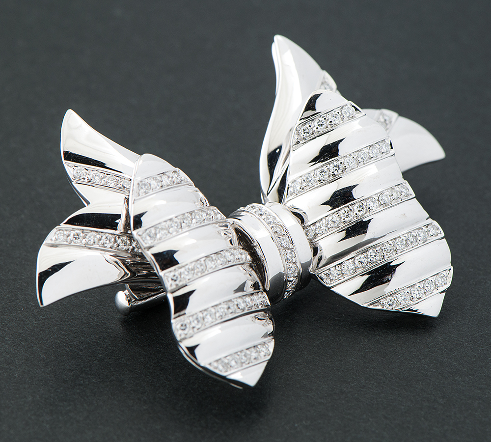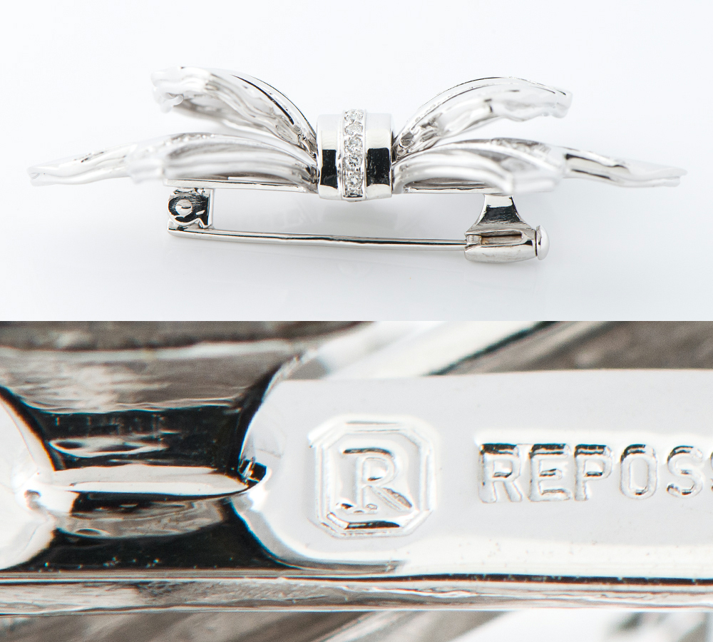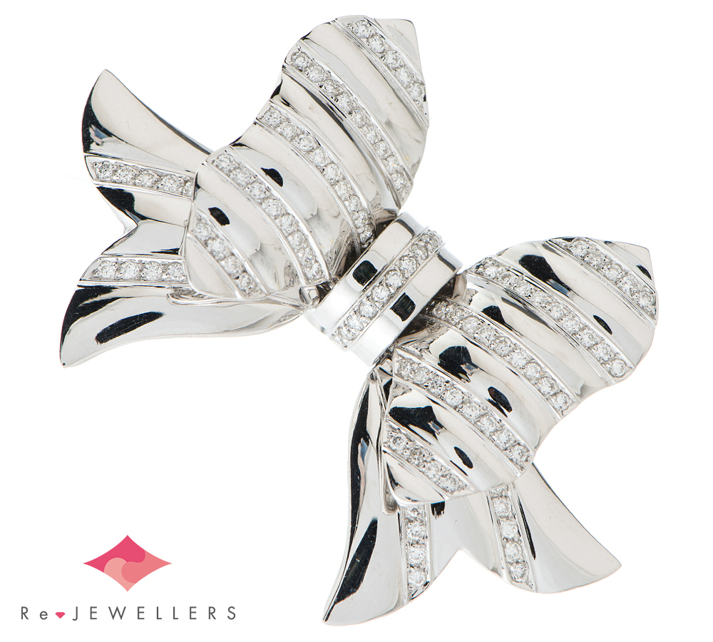 オートクチュールジュエリーから始まったモナコの王室御用達ジュエラーREPOSSI(レポシ)。リボンをモチーフとした人気シリーズ、ボウコレクションのブローチです。鏡面仕上げのホワイトゴールドと、計1ctアップのダイヤモンドでボーダーを描いた可愛らしいデザインは、地金をたっぷり使っているので重量感があります。いろいろなアレンジで楽しんで頂ける華やかなジュエリーです。
