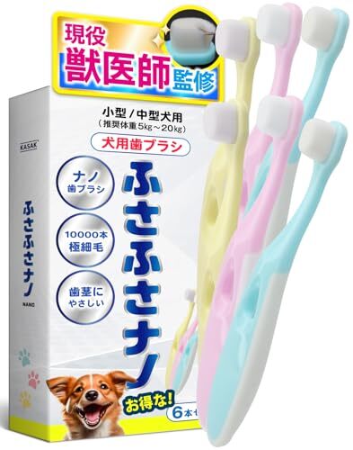 「獣医師監修 犬用歯ブラシ 犬歯磨き 小型犬『ふさふさナノ』10000本の超極細毛歯茎にやさしく出血しないペット/犬/歯磨き/歯石取り/お得な6本」▼4582677350061▼(商品説明)3色/2箱(6本)/-・Color:3色Size:2箱(6本)・ 獣医師 監修 日々たくさんの犬や猫の口腔ケアをしてきた現役獣医師による監修。・ 極ふさ ナノ歯ブラシ 極ふさ、極細のナノ歯ブラシを採用。歯茎からの出血の心配ナシ・ 小さいヘッド 小型犬の口に合わせた小さいヘッドで、奥歯も磨きやすい。・ そり返った持ち手 考え抜いた持ち手の設計。そり返った持ち手により、奥歯が見えやすい、磨きやすい・ サイズ 全長135mm、幅23mm、ブラシ部8mm x 14mm商品の説明 獣医師 監修 日々たくさんの犬や猫の口腔ケアをしてきた現役獣医師による監修。 極ふさ ナノ歯ブラシ 極ふさ、極細のナノ歯ブラシを採用。歯茎からの出血の心配ナシ 小さいヘッド 小型犬の口に合わせた小さいヘッドで、奥歯も磨きやすい。 そり返った持ち手 考え抜いた持ち手の設計。そり返った持ち手により、奥歯が見えやすい、磨きやすい サイズ 全長135mm、幅23mm、ブラシ部8mm x 14mm 安全警告 この商品は小型犬から中型犬用です。飲み込まれると窒息の危険があります。また、この商品は人用ではありません。不適切な使用は怪我をする可能性があります。ご注意ください。