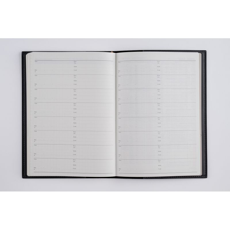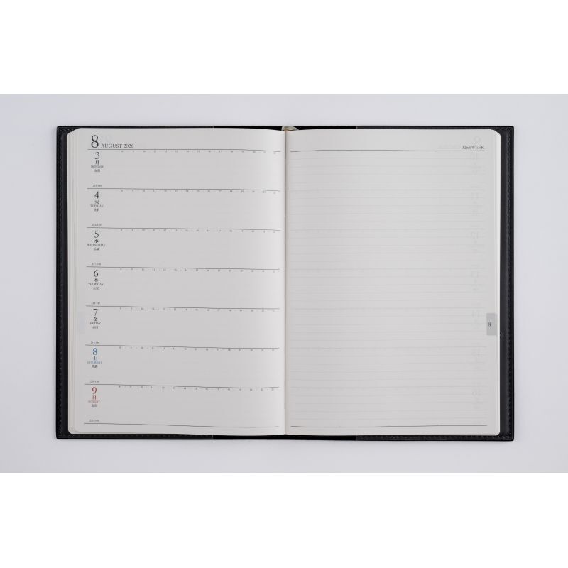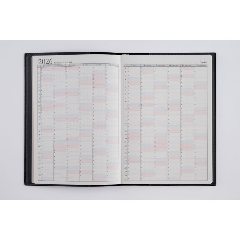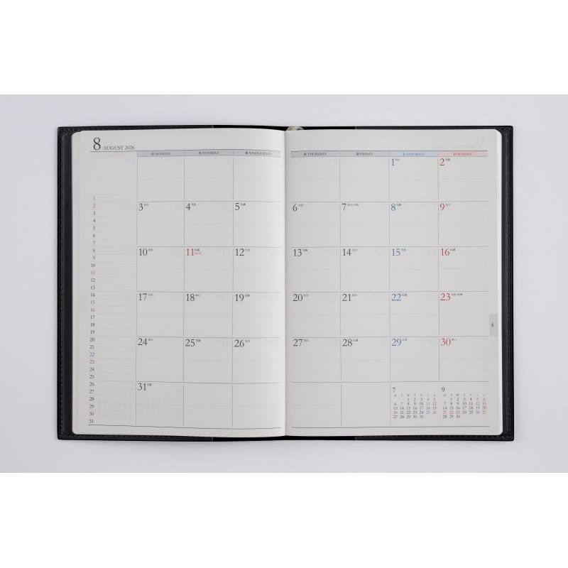 スタンダードな記入形式、上品なフォント、見やすく紙面になじむ刷色など、ストレスなくお使いいただけるのが人気の理由です。月間ページがまとまった月間集約型のページ構成は、月をまたぐ予定管理に便利。
