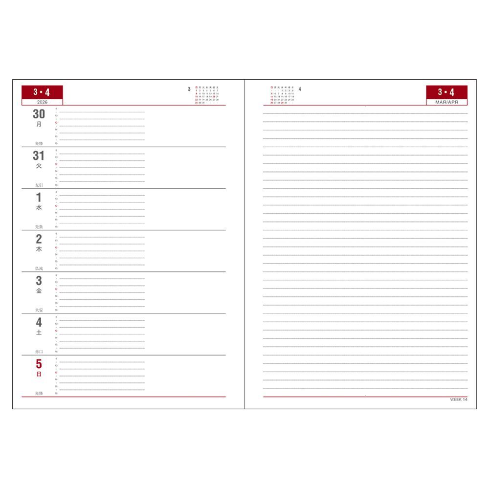左半分が1週間のスケジュール、右半分が横罫のメモスペースで、1週間の予定とメモを見開きで管理できる1番人気のレイアウトです。