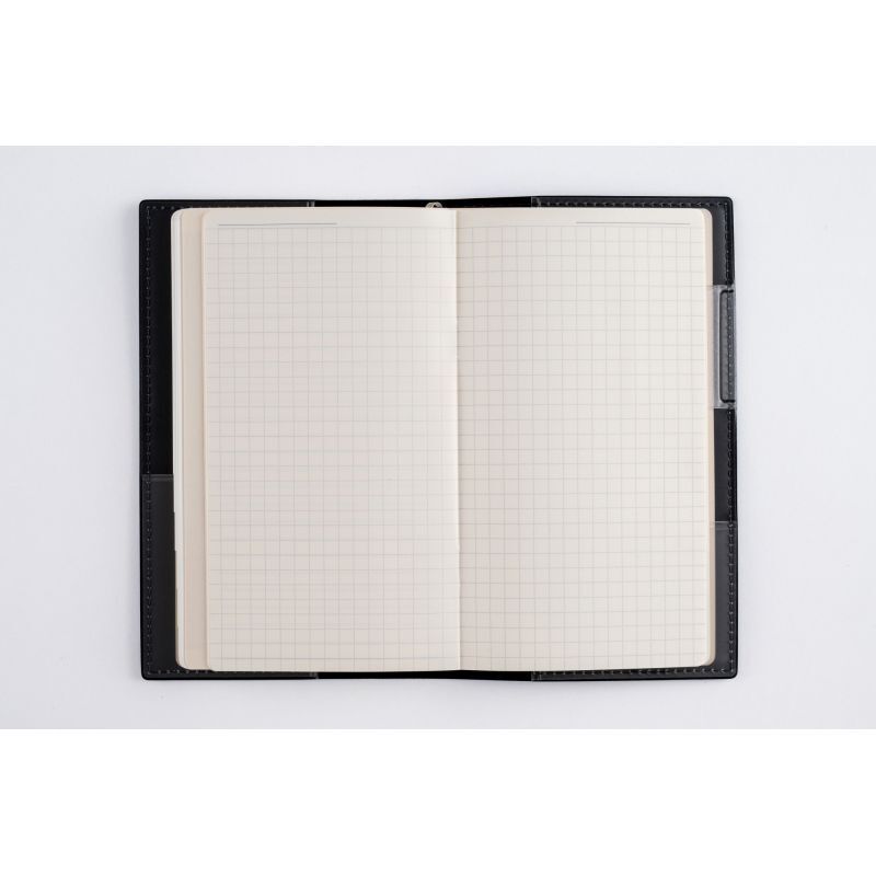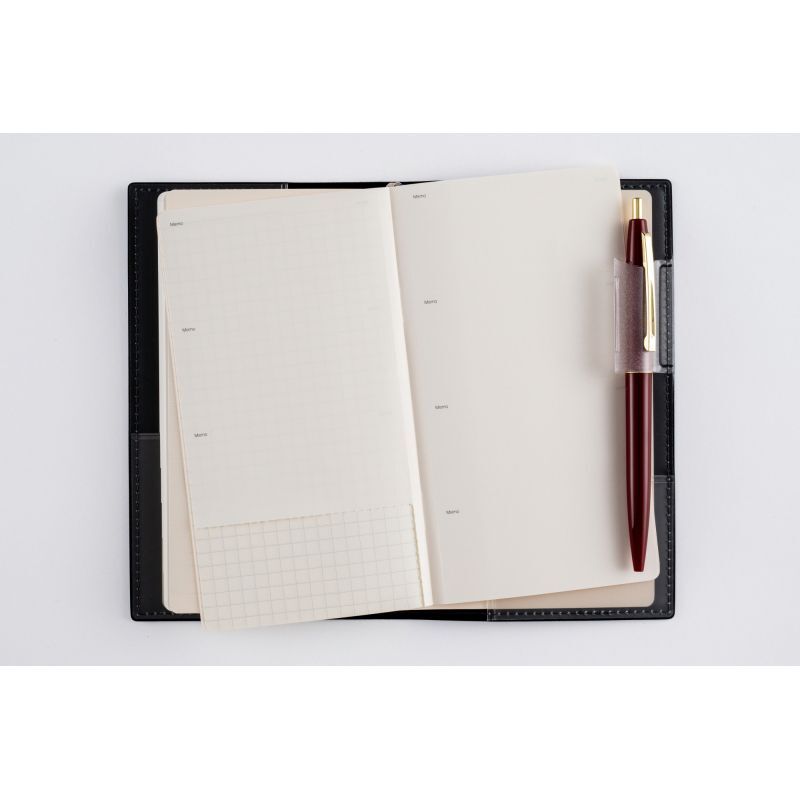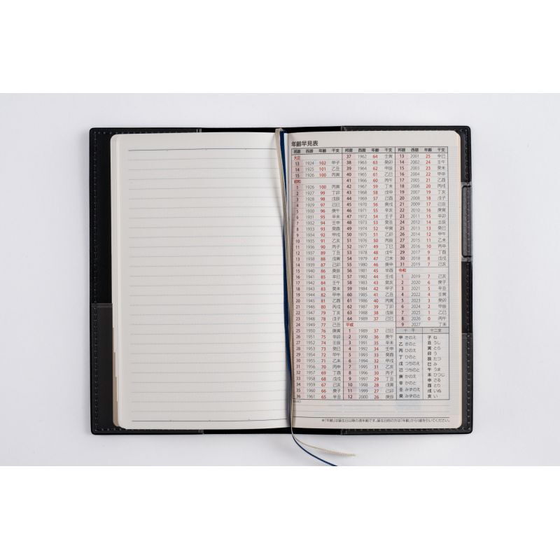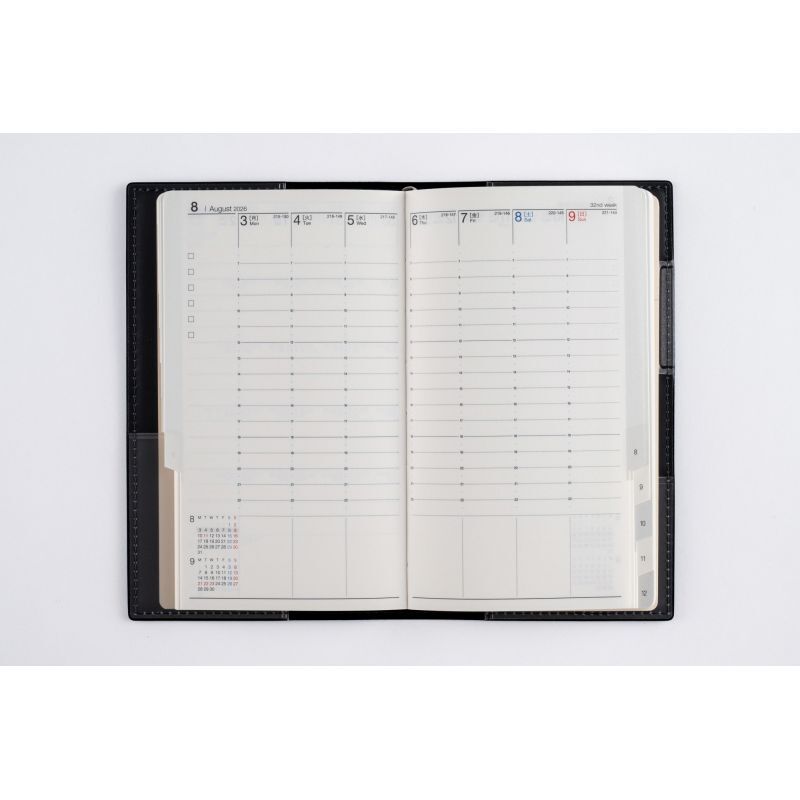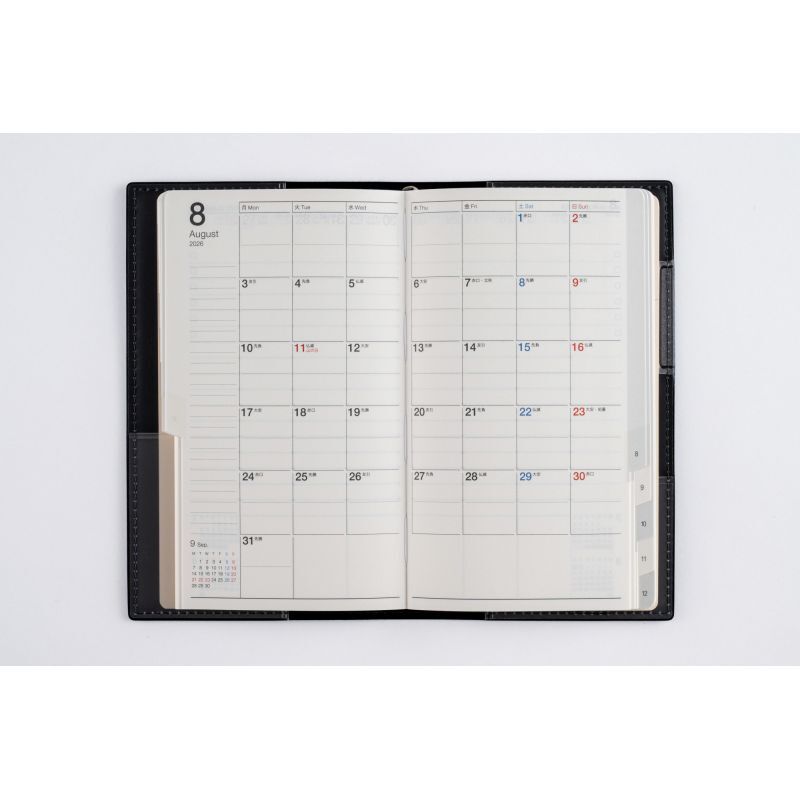 皮革調のカバーにシンプルなロゴとステッチが入った上質でカジュアルなデザイン。6~23時まで記入できるバーティカル式で、見たい月をすぐに開けるインデックス付き。