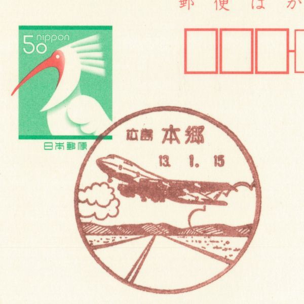 風景印☆初日☆広島・本郷・H13.1.15・旅客機
