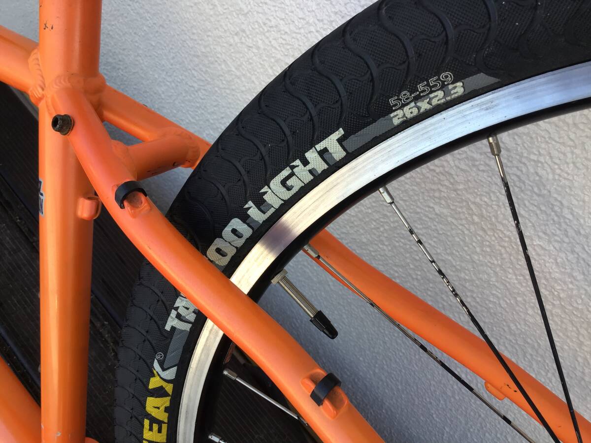 タイヤ26インチ用フレームです。タイヤ装着時のクリアランスは写真にて確認してください。