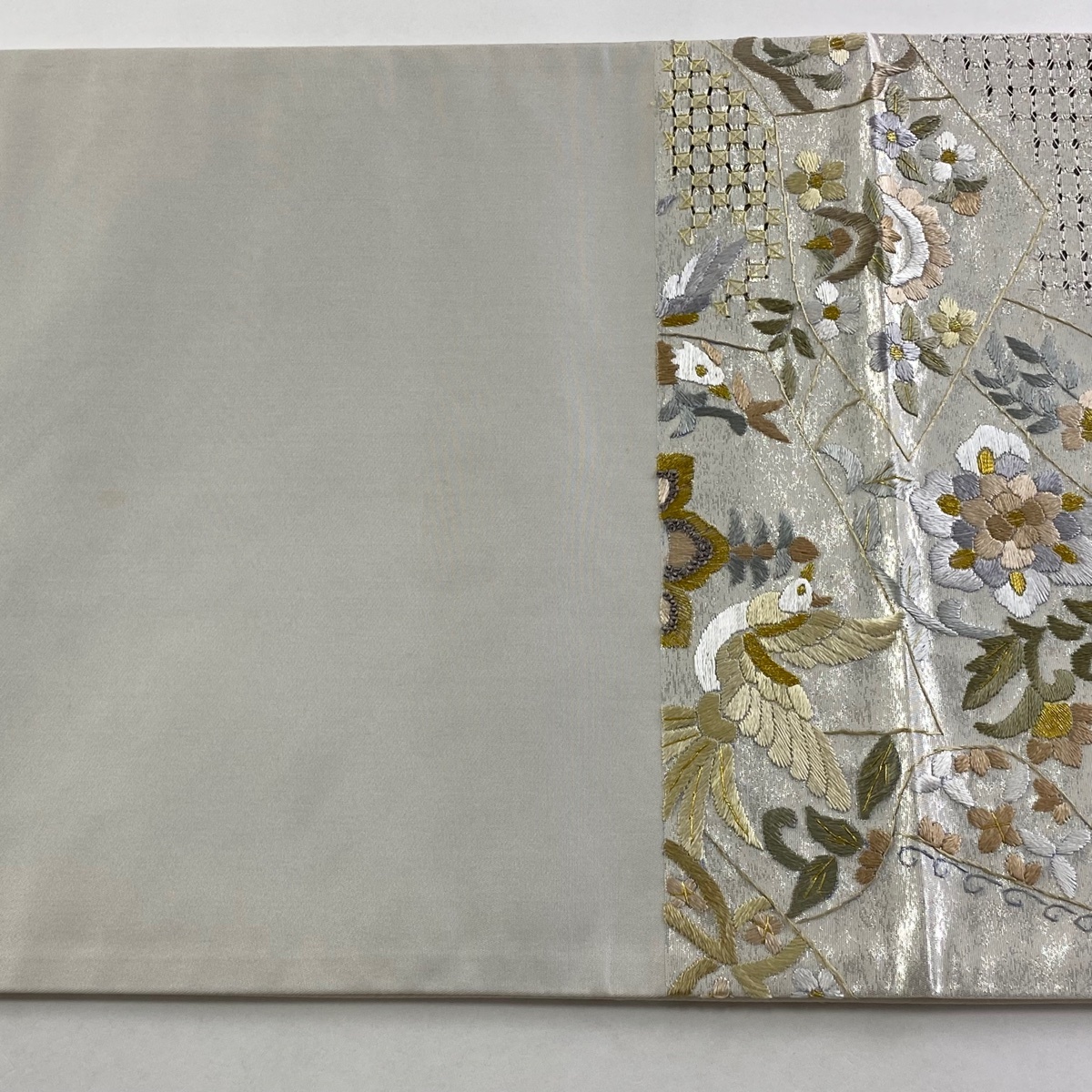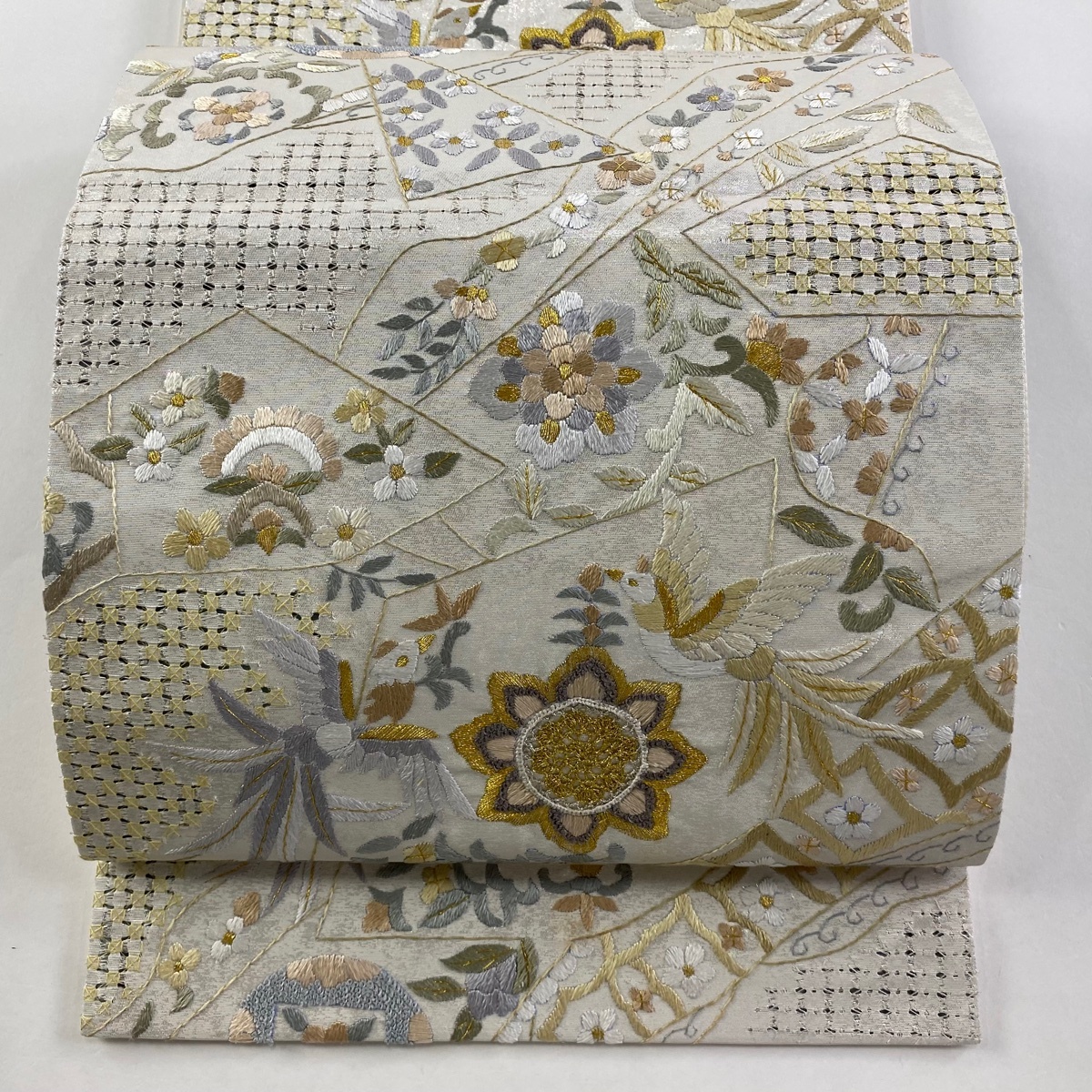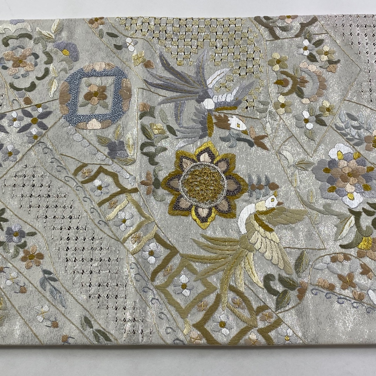 | 袋帯 逸品 やまと 華文 尾長鳥 刺繍 金銀糸 銀色 六通 正絹 【中古】 |