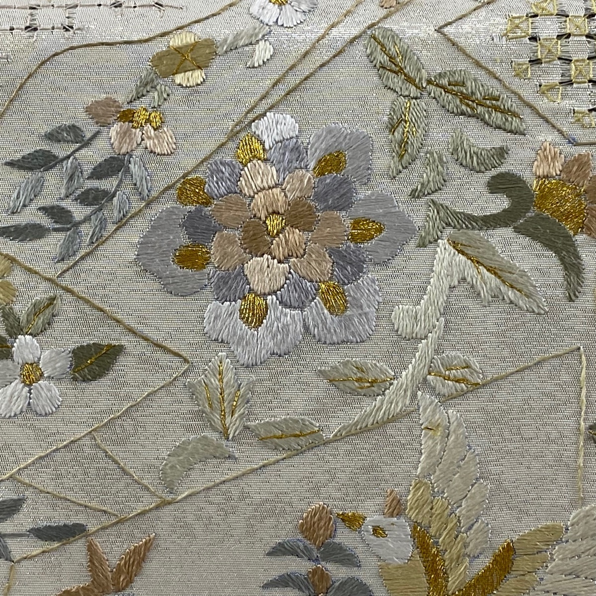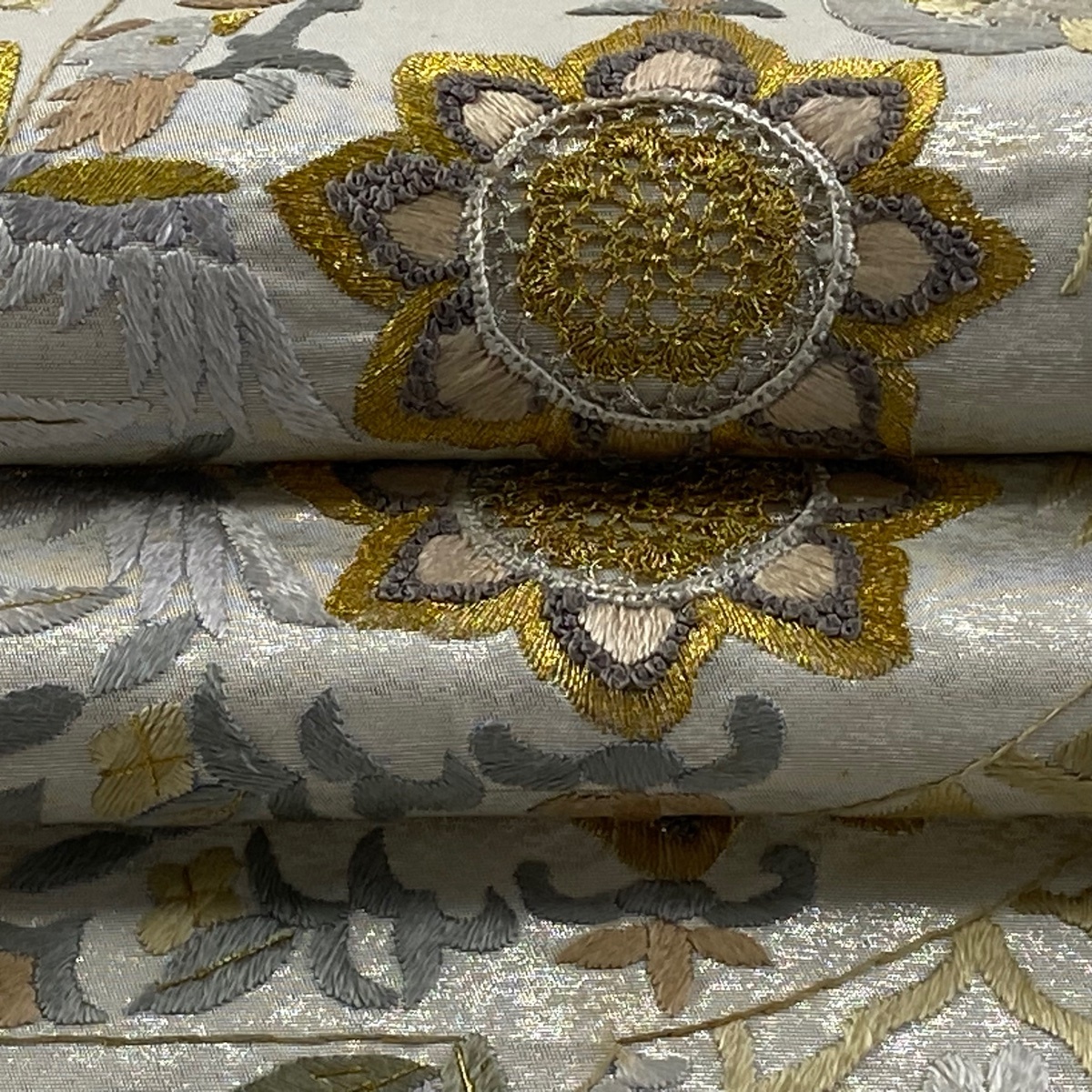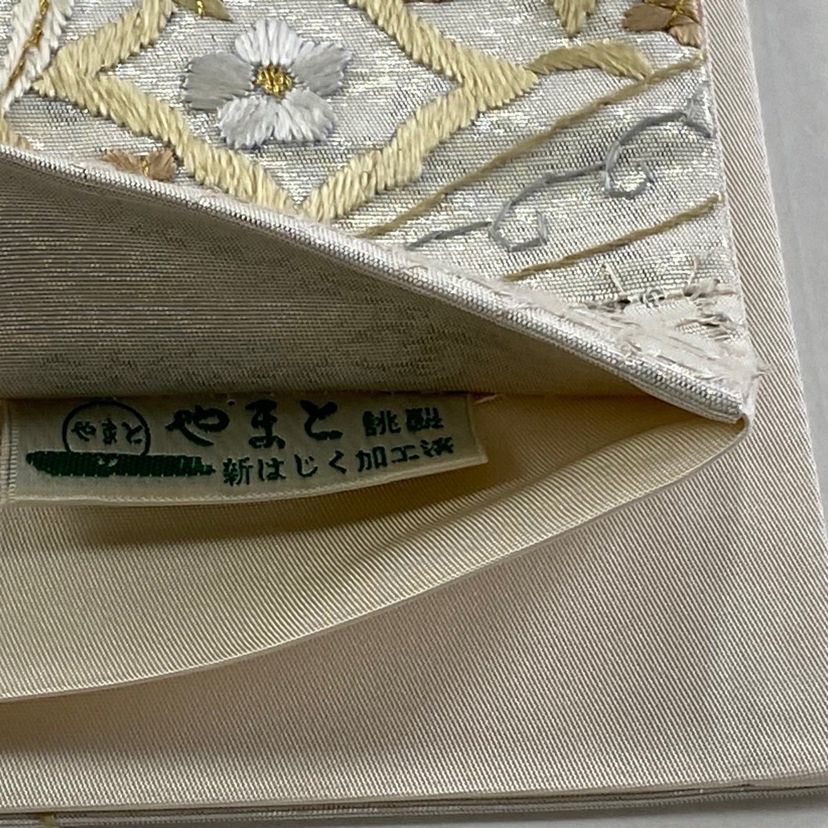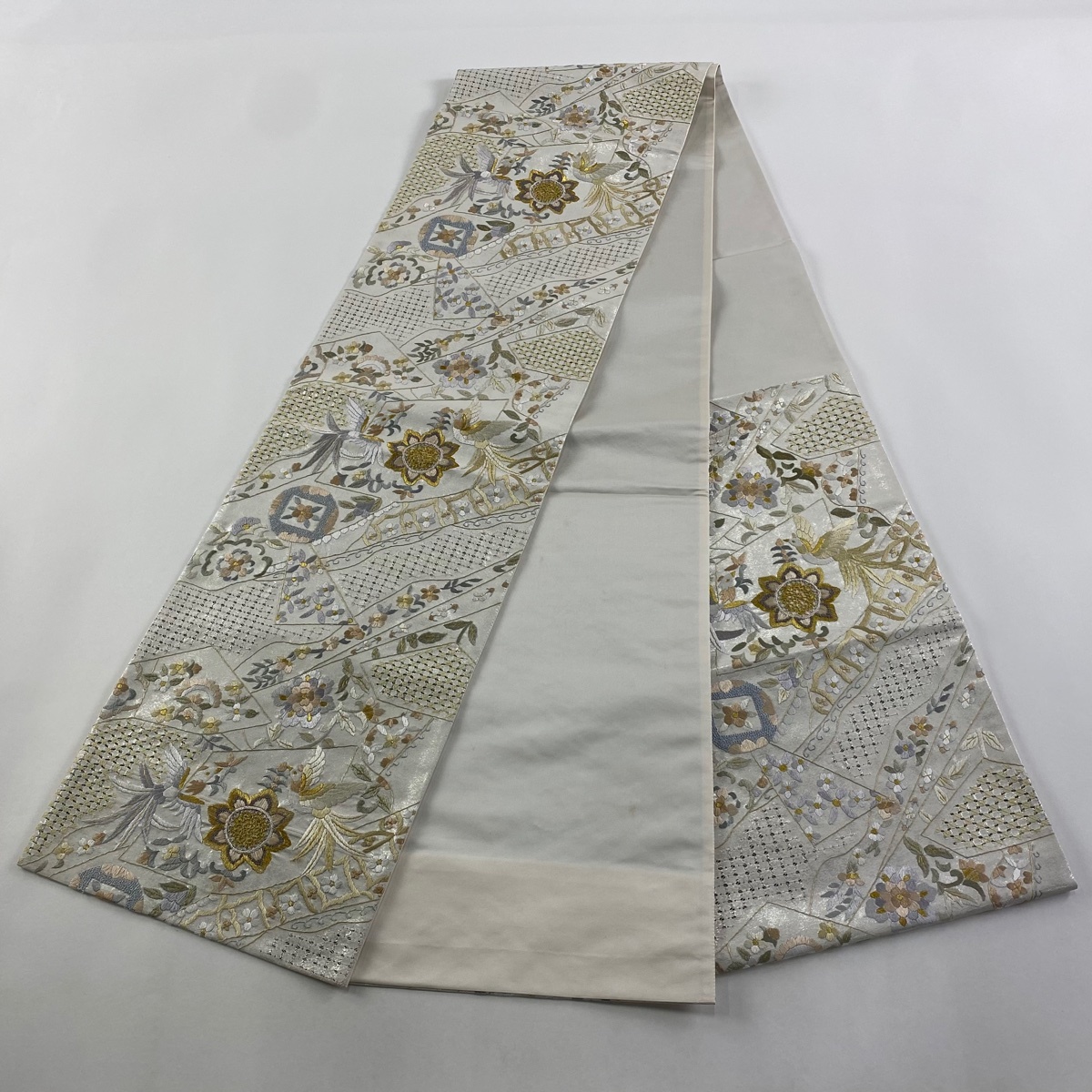 | 袋帯 逸品 やまと 華文 尾長鳥 刺繍 金銀糸 銀色 六通 正絹 【中古】 |