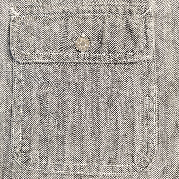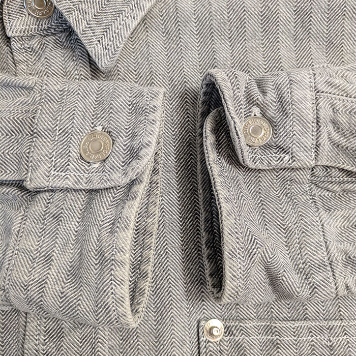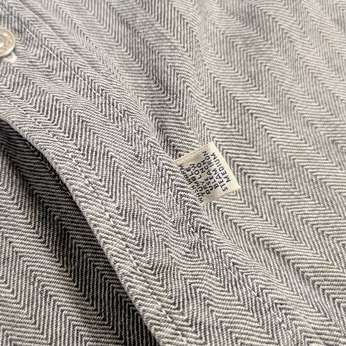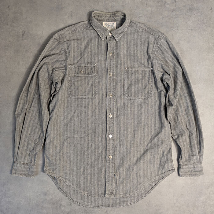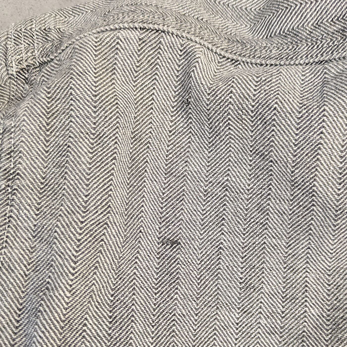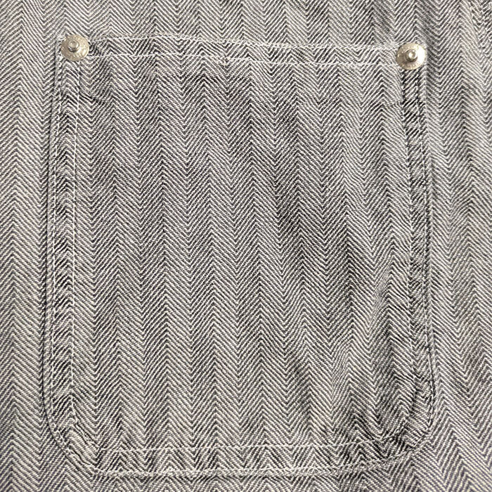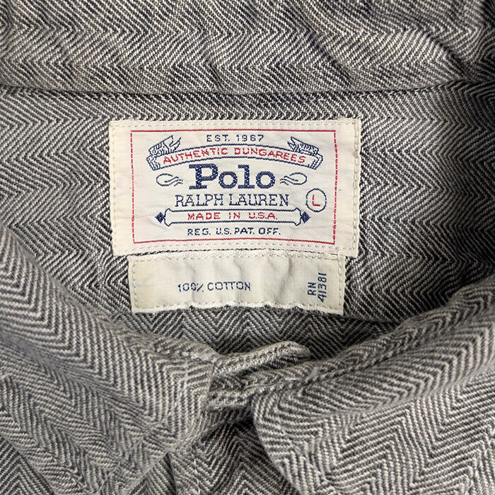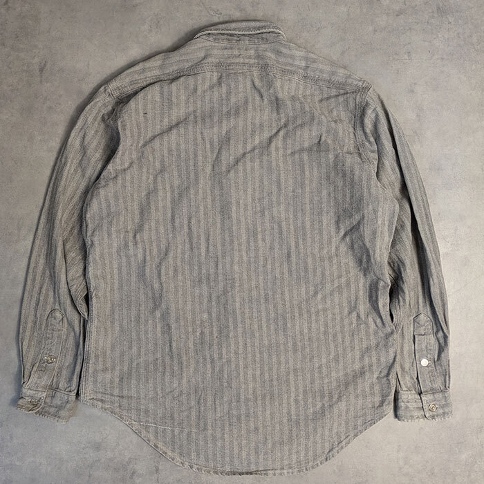 ヘリンボーンシャツ サイズ表記 L およそのサイズ 肩幅(約48cm) 身幅(約64cm) 袖丈(約65cm) 着丈(約84cm) 80-90年代によくみたヘリンボーン生地となり、特徴的なボタンとリベット留め 生地も厚みがあり非常にタフな印象の1枚です。 サイズも大きすぎず小さすぎずとなり、90年代にこのタイプの生地違いを数多く見てきましたが ヘリンボーンは押さえておきたい1枚ではないでしょうか? 背中などに見受けられるネップなんかもこの生地の特徴かと思います。 その他、使用感や擦れ、汚れ等の細かいダメージはありますが、着用に致命的なダメージはありません。 古着となりますので、ご理解の上、神経質な方はご入札を控えて頂きます様お願い致します。 |