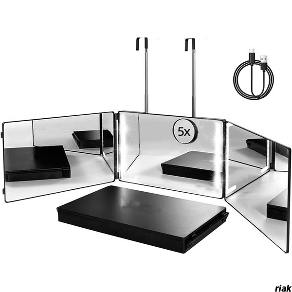 【ワンタッチでON/OFF、長押しで明るさを調整可能】 セルフカットミラー 三面鏡 折りたたみ LED付き鏡 充電式 拡大鏡付き ブラック01