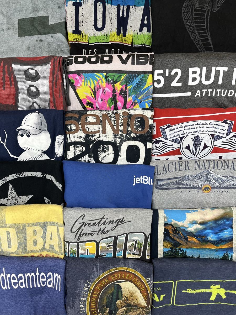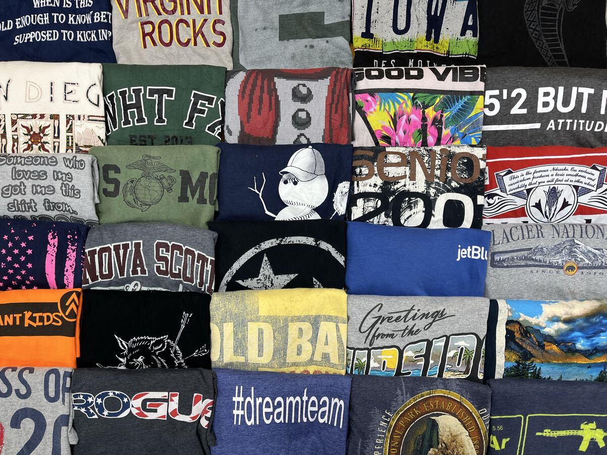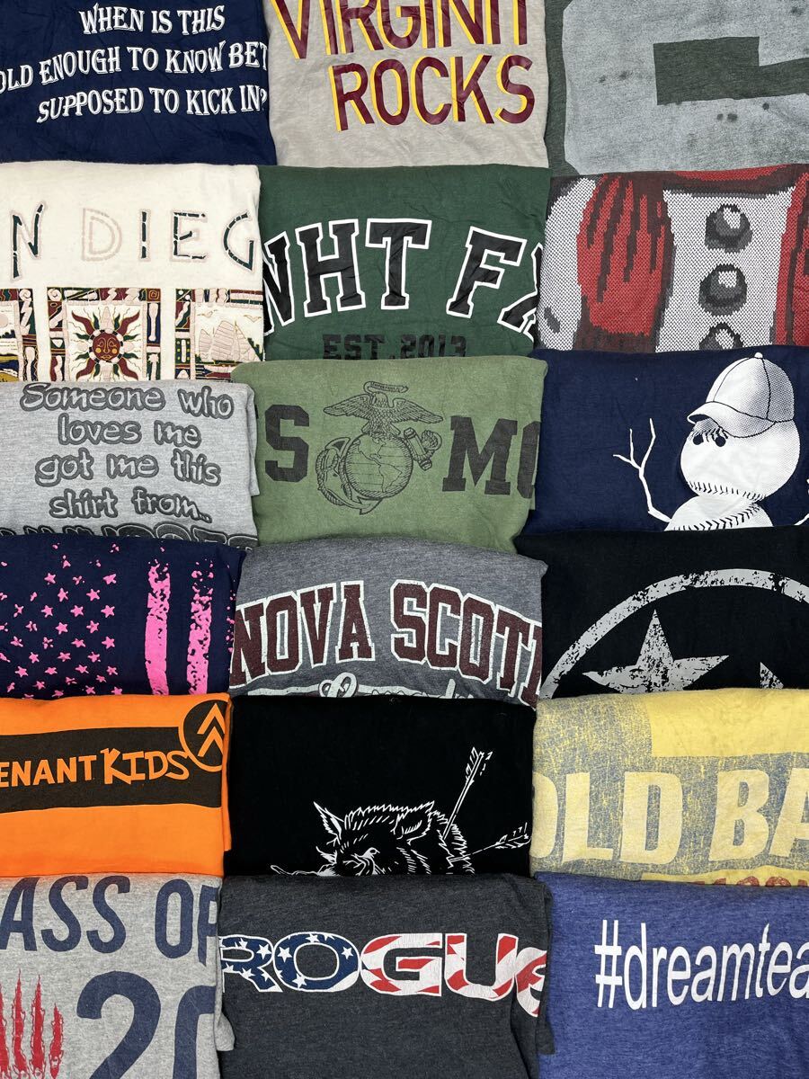 両面プリント・バックプリント ・ワンポイント ・バンドロック・キャラクター・チーム物・無地・柄・ロゴ・丸首・Vネックなど様々なデザインのランダムミックスになります。