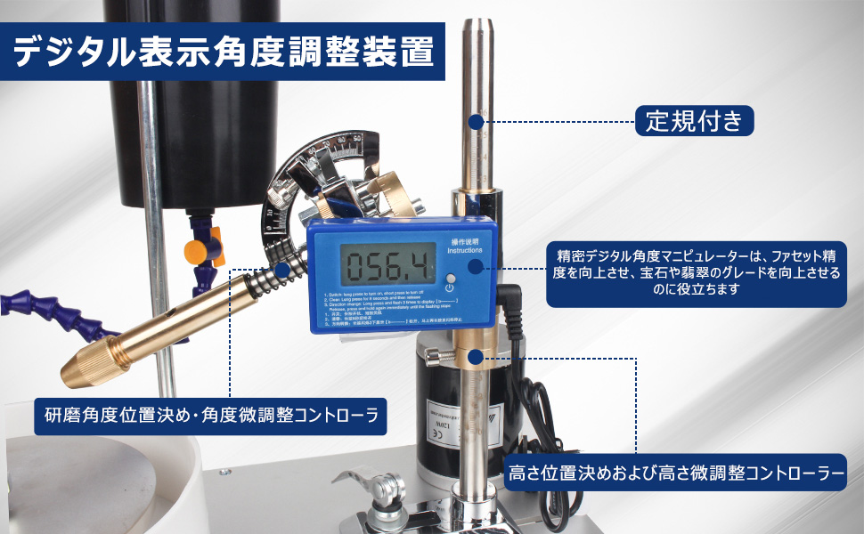 アングルマニピュレーターデジタルディスプレイ:宝石加工マニピュレーター、高度な宝石加工マニピュレーターは、正確なインデックス、安定したスピンドル、信頼性の高い表面研削、柔軟な使用、機械全体の高い堅牢性と耐久性、加工プロセスの高度な自動化、高い製品品質と高い作業効率を備えています。