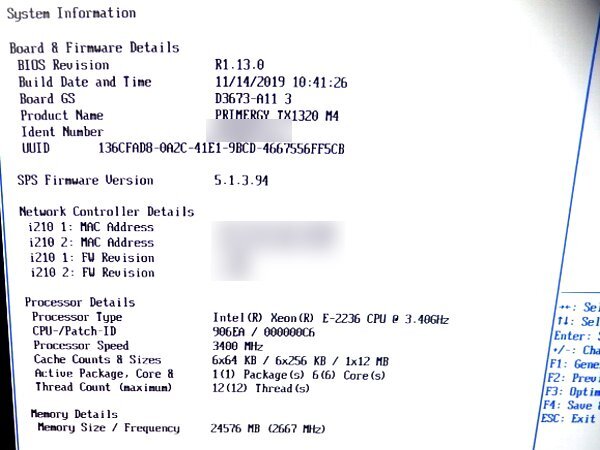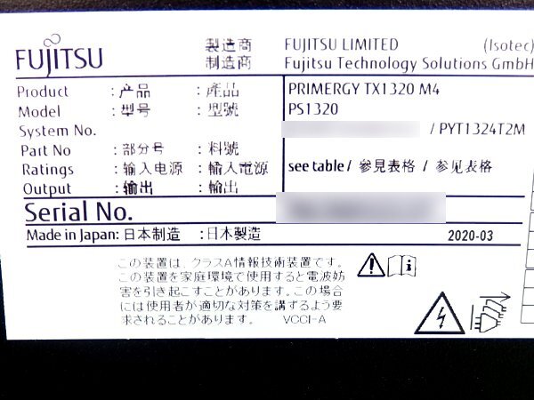 ■○ FuJitsu PRIMERGY TX 1320 M4 PYT1324T2M Xeon E-2236 3.40GHz/メモリ 24GB/HDD1.2TB×4/OS無し/BIOS起動確認済み