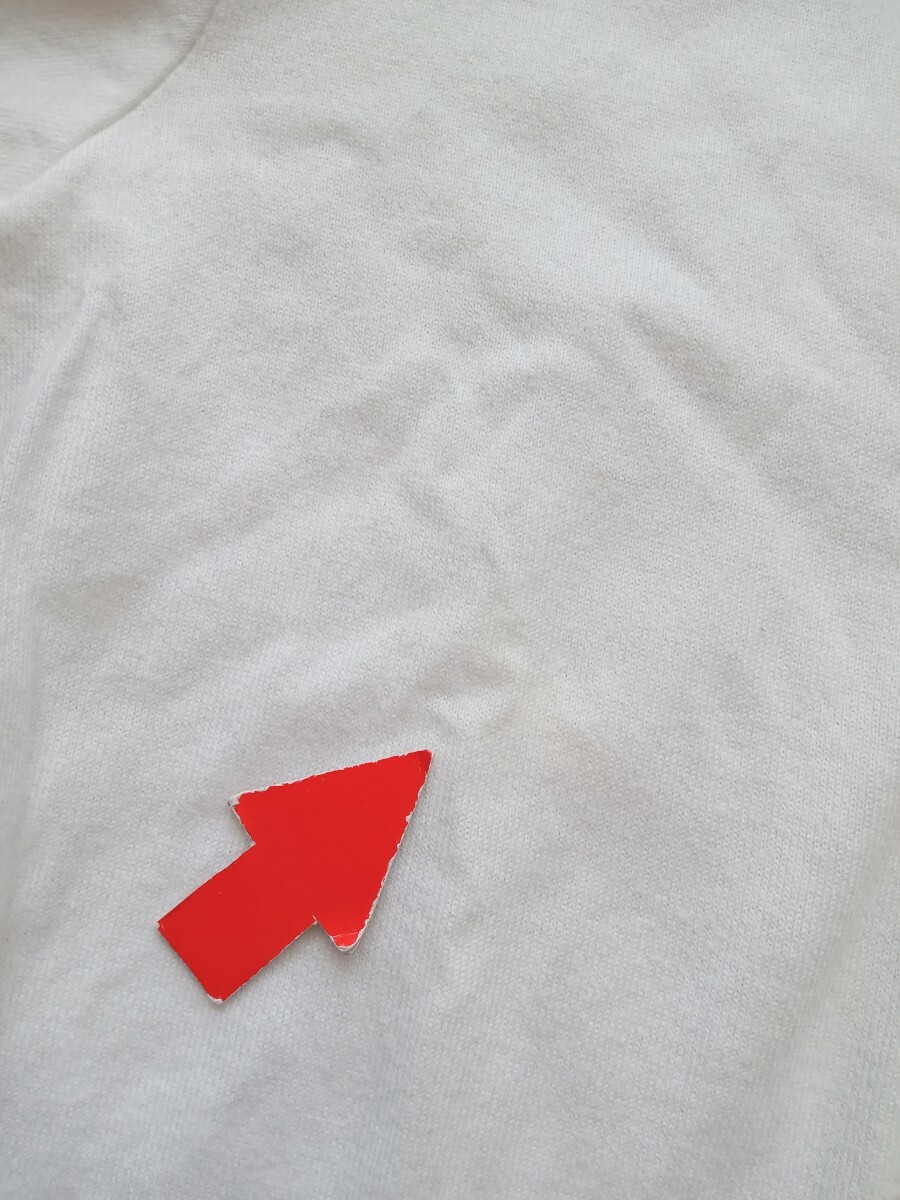 少し着用感と全体に毛羽立ち、右腹部に1cm大のシミ1か所、左袖背面に5mm程のシミ1か所あります。