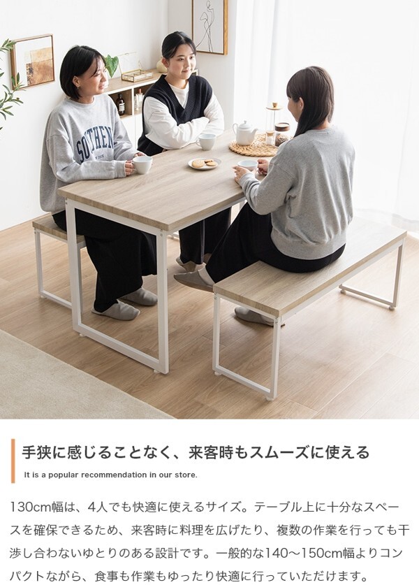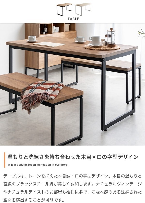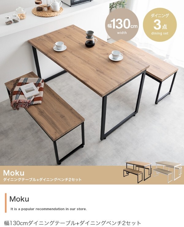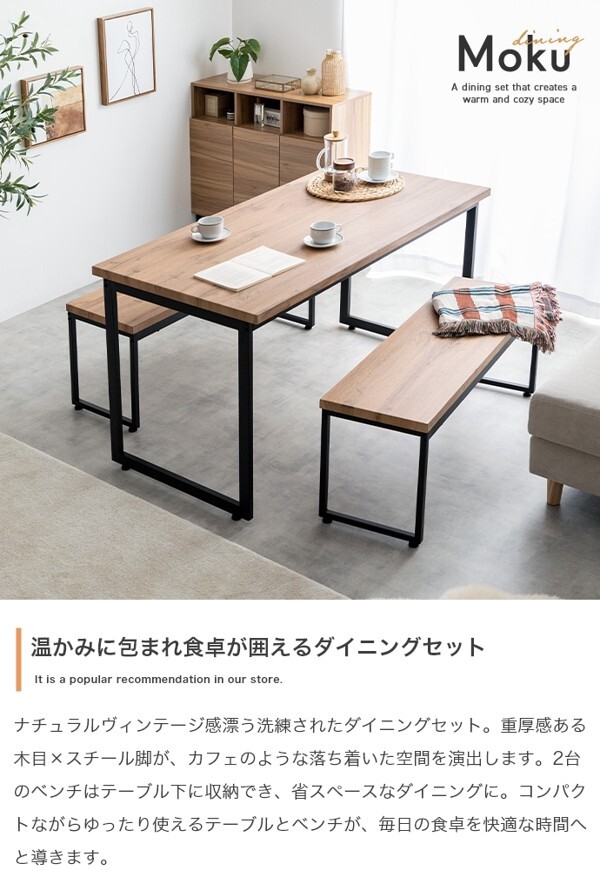 ※現在ご覧の商品ページはナチュラル/ブラックのご購入ページとなります。 ヤフオクの仕様上単一ページに複数バリエーションを掲載することができませんので、他バリエーションが希望の場合は別ページでご購入お願い致します。 ナチュラルヴィンテージ感漂う洗練された雰囲気の『Moku(モク)』ダイニングセット。 重厚感ある木目調×ブラックスチール脚がスタイリッシュなデザインで、カフェにいるような落ち着いた空間を演出します。 また2台のベンチはテーブル下にすっきり収納できるため、省スペースなダイニングに。 コンパクトながらゆったり使えるテーブルと使い勝手の良いベンチが、毎日の食卓を快適な時間へと導きます。 配達業者を指定いただくことはできません。 沖縄・離島に関しましては、別途配送料が必要となります。 北海道への配送も別途配送料が必要になる場合がございます。 ※別途送料が発生する場合は後ほどご連絡させていただきます。 タイミングによっては在庫切れの場合があります。